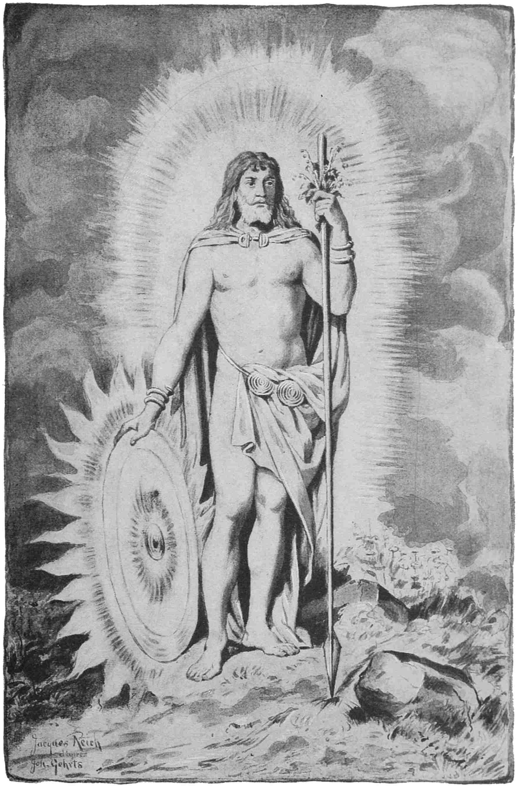Balder, the radiant god of sunshine, reminds us not only of Apollo and Orpheus, but of all the other heroes of sun myths. His wife Nanna is like Flora, and still more like Proserpine, for she, too, goes down into the underworld, where she tarries for a while. Balder’s golden hall of Breidablik is like Apollo’s palace in the east; he, too, delights in flowers; all things smile at his approach, and willingly take an oath of allegiance to him. Just as Achilles is vulnerable only in the heel, Balder can be slain only by the harmless mistletoe, and his death is occasioned by Loki’s jealousy just as truly as Hercules was slain by Dejanira’s. Balder’s funeral pyre on Ringhorn reminds us of Hercules’s death on Mount Œta, the flames and reddish glow of both fires serving to typify the setting sun. The Northern god of sun and summer could only be released from Nifl-heim if all animate and inanimate objects shed tears; so Proserpine could issue from Hades only upon condition that she had partaken of no food. The trifling refusal of Thok to shed a single tear is like the pomegranate seeds which Proserpine ate, and the result is equally disastrous in both cases, as it detains Balder and Proserpine underground, and the earth (Frigga or Ceres) must continue to mourn their absence.
