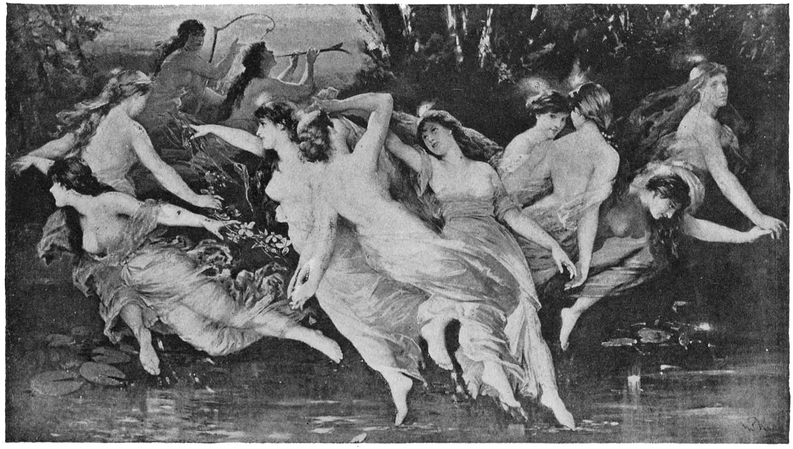 Just as the Greeks fancied that the tempests were the effect of288 Neptune’s wrath, so the Northern races attributed them either to the writhings of Iörmungandr, the Midgard snake, or to the anger of Ægir, who, crowned with seaweed like Neptune, often sent his children, the wave maidens (the counterpart of the Nereides and Oceanides), out to play in the tossing billows. Neptune had his dwelling in the coral caves near the Island of Eubœa, while Ægir lived in a similar palace near Cattegat. Here he was surrounded by the nixies, undines, and mermaids, the counterpart of the Greek water nymphs, and by the river-gods of the Rhine, Elbe, and Neckar, who remind us of Alpheus and Peneus, the river-gods of the Greeks.
