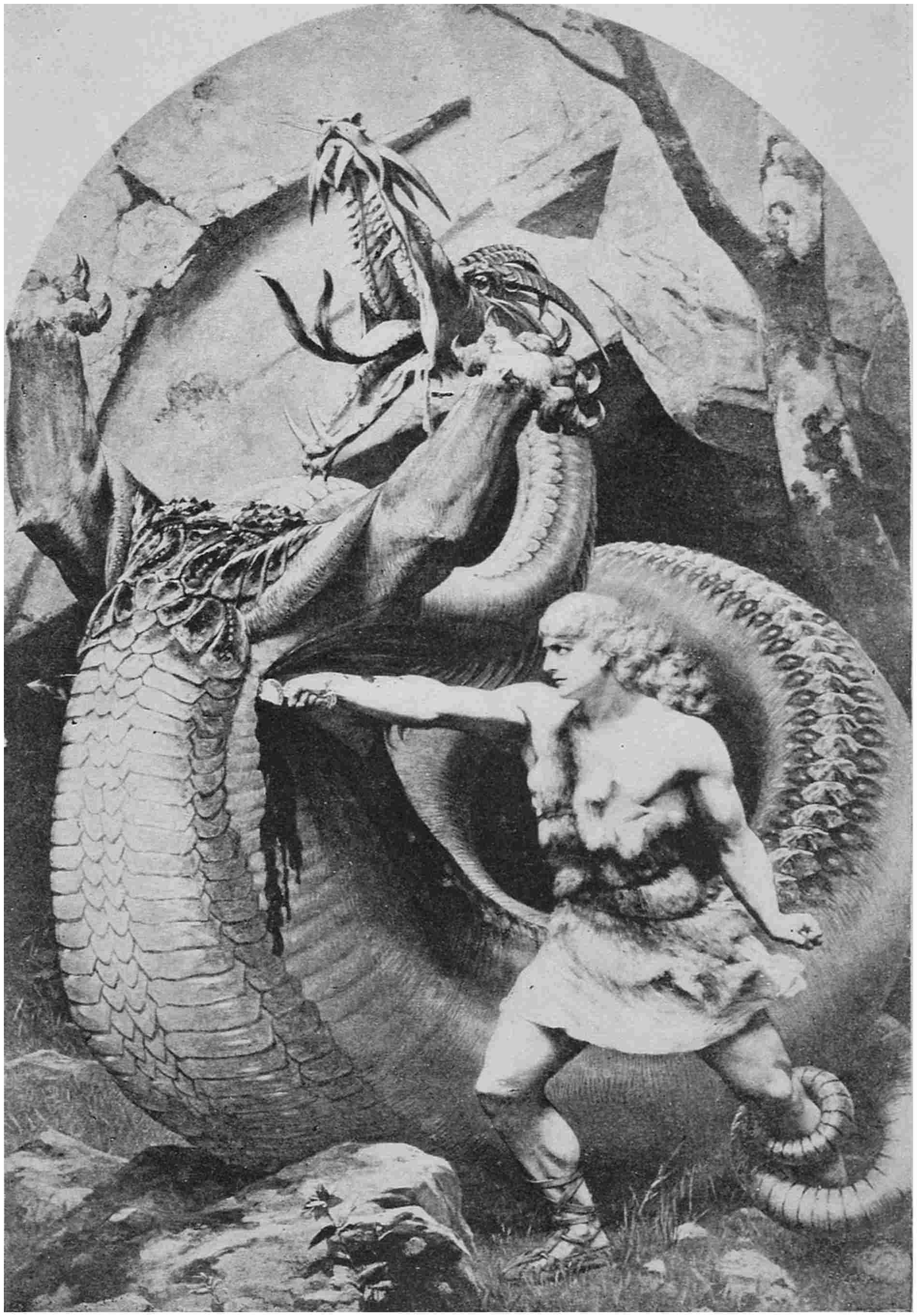The marvelous sword which becomes the property of Sigmund and of Sigurd as soon as they prove themselves worthy to wield it reminds us of the weapon which Ægeus concealed beneath the rock, and which Theseus secured as soon as he had become a man. Sigurd, like Theseus, Perseus, and Jason, seeks to avenge his father’s wrongs ere he sets out in search of the golden hoard, the exact counterpart of the golden fleece, which is also guarded by a dragon, and is very hard to secure. Like all the Greek sun-gods and heroes, Sigurd has golden hair and bright blue eyes. His struggle with Fafnir reminds us of Apollo’s fight with Python, while the ring Andvaranaut can be likened to Venus’s cestus, and the curse attached to its possessor is like the doom which accompanied Helen and caused endless bloodshed wherever she went.