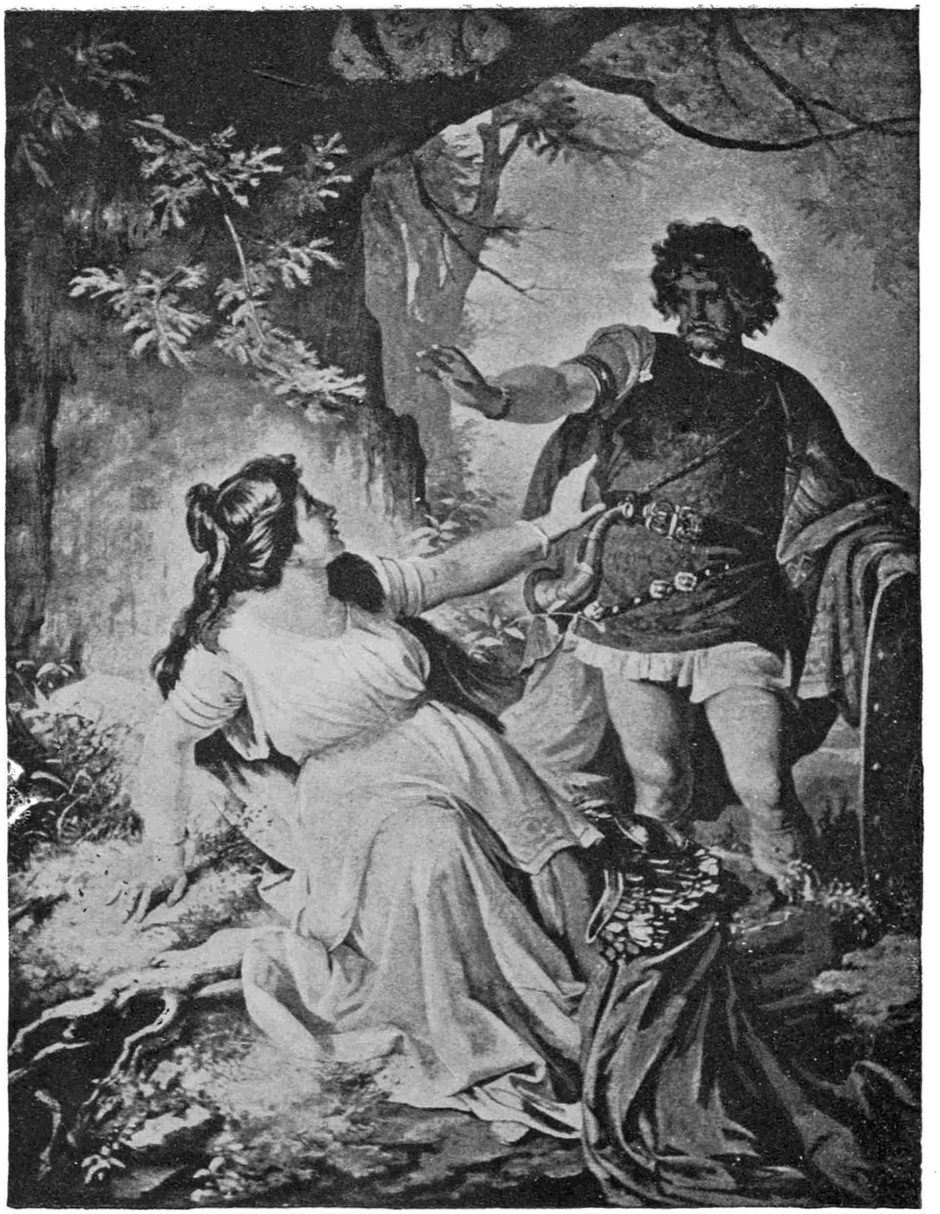 Brunhild resembles Minerva in martial tastes, in physical appearance,292 and in knowledge; but when Sigurd deserts her in favor of Gudrun, she becomes angry and resentful like Œnone, when Paris left her to woo Helen. Brunhild’s anger continues to accompany Sigurd through life, and she even seeks to compass his death, while Œnone, feeling she can cure her wounded lover, refuses to do so and permits him to die. Œnone and Brunhild are both overcome by the same remorseful feelings when their lovers have breathed their last, and both insist upon sharing their funeral pyres, and end their lives lying by the side of those whom they had loved.