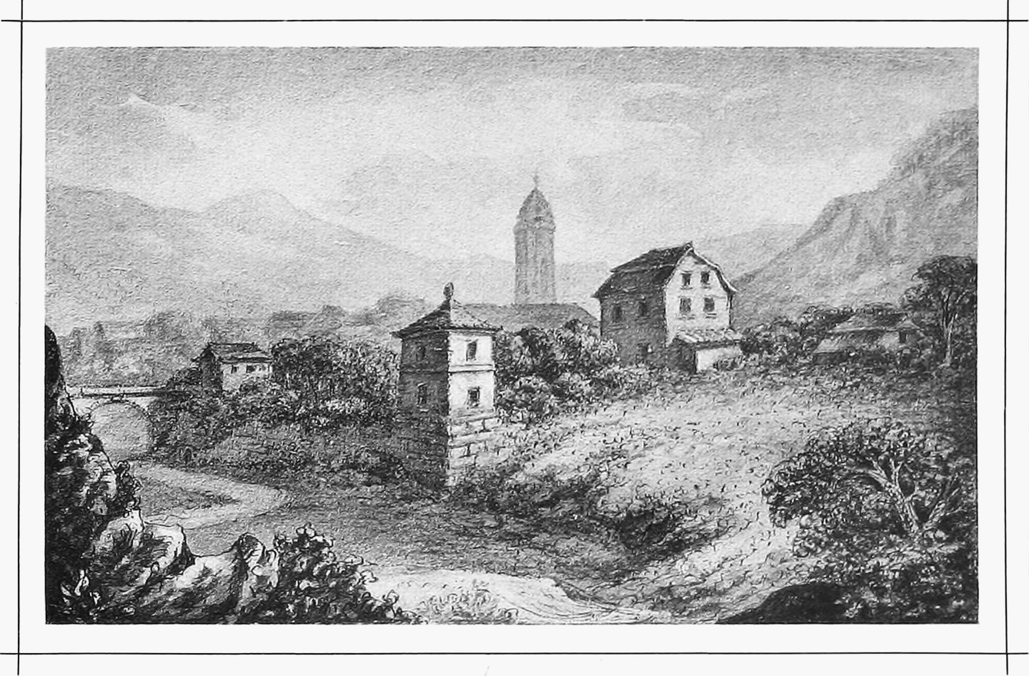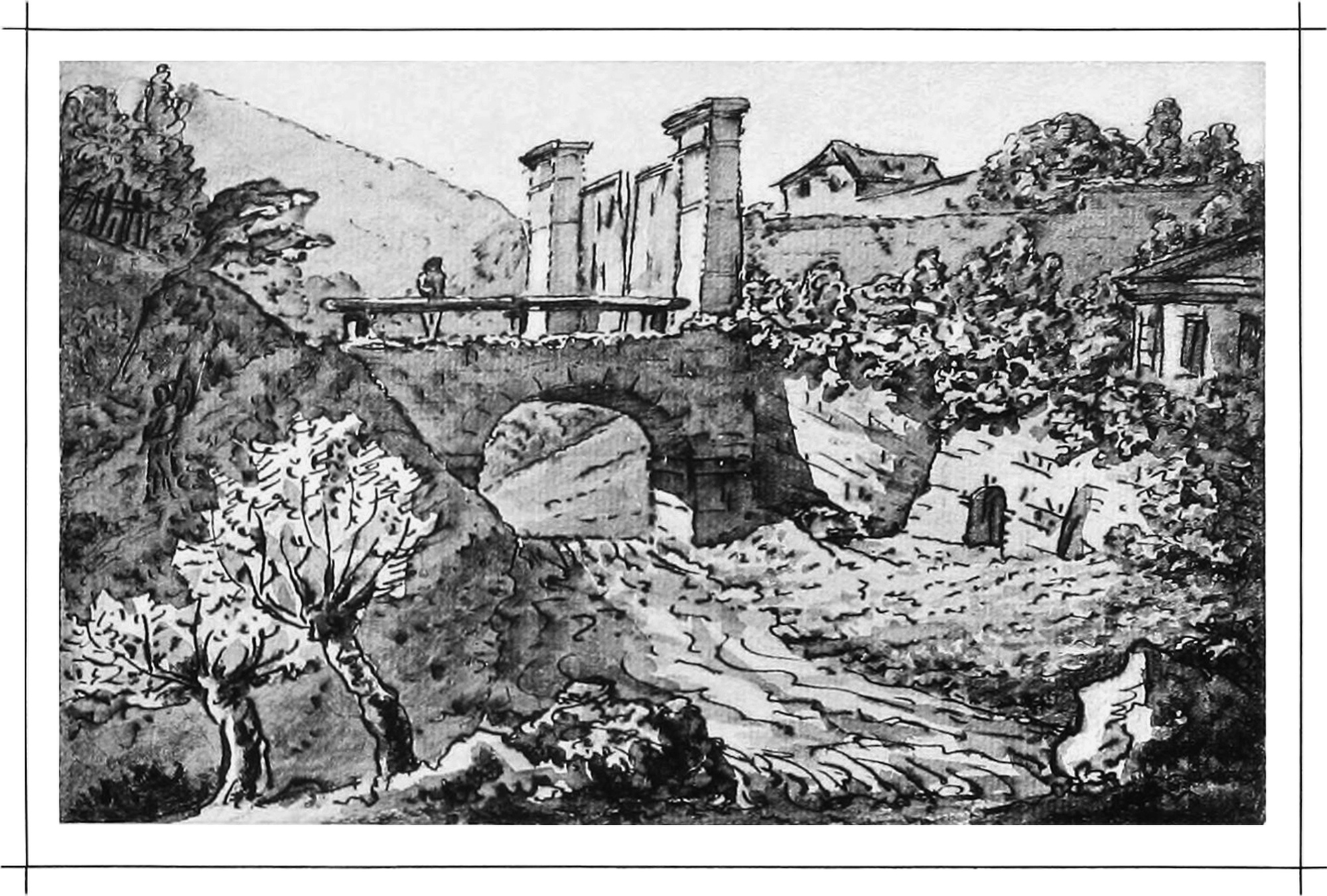 Das Engelgatter und Brücke, an Ort und Stelle, obgleich wild, doch mehr an der Wirklichkeit, gezeichnet vom[S. 6] Fußpfad auf der Höhe des linken Ufers der Leutra; Substructionen und Häuschen auf der rechten Seite gehören zu Schillers Garten.