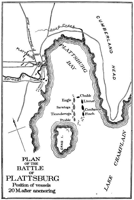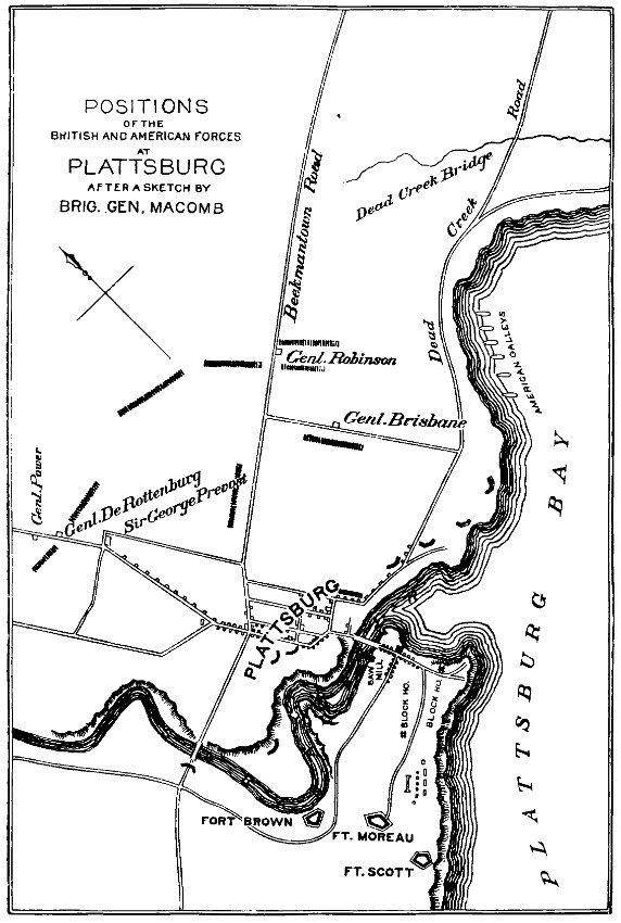 After the close of the campaign on the St. Lawrence, in November, 1813, General Wilkinson’s army, numbering about eight thousand men, sick and well, went into winter-quarters at French Mills, on the Canada line, about eight miles south of the St. Lawrence. Wilkinson was unfit for service, and asked leave to remove to Albany, leaving Izard in command; but Armstrong was not yet ready to make the new arrangements, and Wilkinson remained with the army during the winter. His force seemed to stand in a good position for annoying the enemy and interrupting communications between Upper and Lower Canada; but it lay idle between November 13 and February 1, when, under orders from Armstrong, it was broken up.[23] Brigadier-General Brown, with two thousand men, was sent to Sackett’s Harbor. The rest of the army was ordered to fall back to Plattsburg,—a point believed most likely to attract the enemy’s notice in the spring.[24]