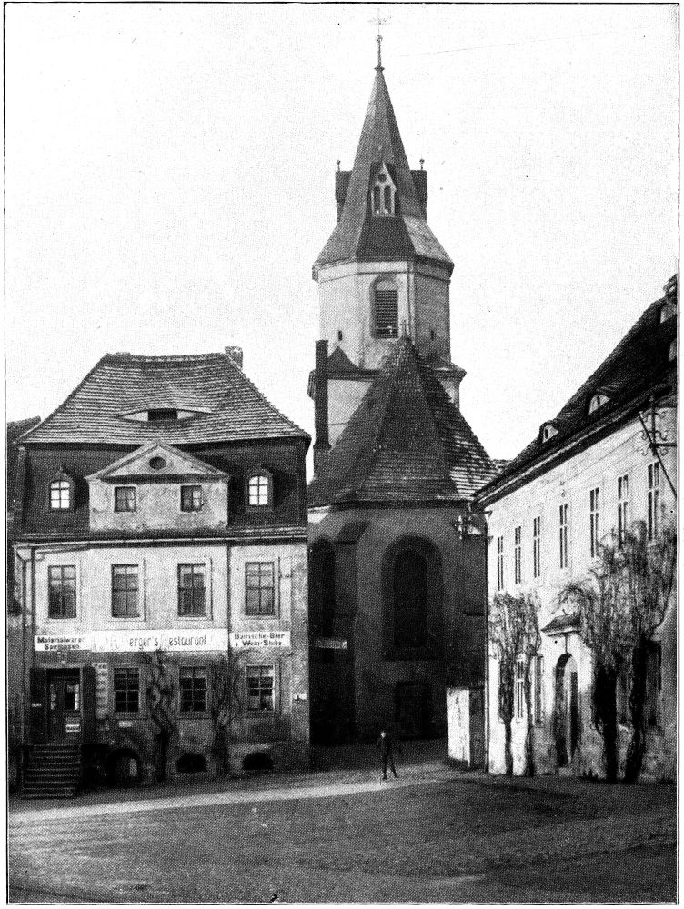 Wolkenlos und sengend heiß brütet ein stiller Sommernachmittag über der weiten Elsteraue. Ich steige von der staubigen Landstraße den kurzen, steilen[10] Fußpfad zum Gotteshaus empor. Rechts des äußeren Friedhofseinganges schattet breitkronig eine alte Linde, und ihr Blütenduft, von keinem Windhauche verweht, versetzt urplötzlich ins Märchenreich der Romantik. Der weißhaarige Totengräber öffnet die Pforte, und – ich stehe gebannt von der Schönheit des Durchblicks, wie ihn Meister Sippel mit ausgesuchter Kühnheit in Abbildung 4 auf die Platte gebannt hat. Vom dunklen Vordergrund hebt sich lichtübergossen der Vorplatz mit dem schmucklosen, romanischen Porphyrportal ab. Ich trete ein in die kühle Vorhalle. Eine freudige Überraschung![11] An den Wänden hängen drei alte Schnitzwerke. Zunächst der Mittelschrein eines Flügelaltars mit der heiligen Anna selbdritt, Johannes dem Täufer und einer heiligen Frau ohne Bezeichnung. Auf dem Kirchboden fand ich später die dazu gehörigen beiden Seitenflügel, innen ohne Schnitzwerke, außen mit Heiligenbildern bemalt. Das zweite, kleinere Schnitzwerk in der Vorhalle, die Fußwaschung Christi durch Maria Magdalena darstellend, scheint ein Innenfeld des einen Flügels ausgefüllt zu haben. Das dritte und kleinste Schnitzwerk, stark beschädigt und ohne Bemalung, stellt nach Steche die[12] Geißelung Christi, nach Ansicht anderer Kunstkenner die Geißelung Pauli dar. Es hat mit dem Flügelaltar nichts zu tun und stammt, wie die beiden anderen Holzbildwerke, aus der Zeit um 1500.
