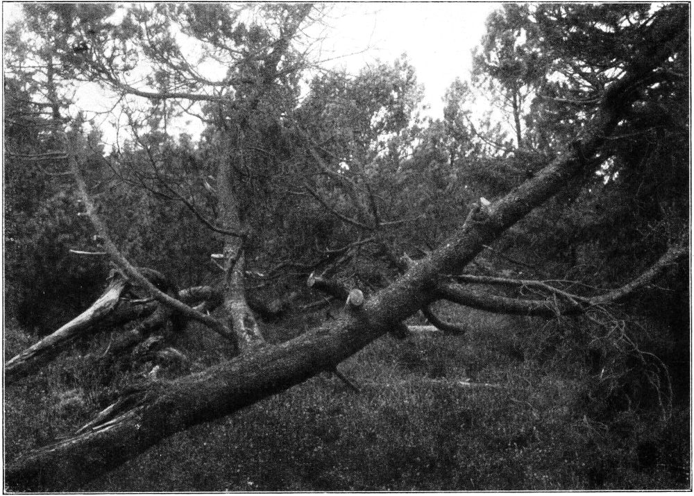 Feuchtende Nebel, zerzausende Wetterschauer und lastende Eismantel schufen die zerkämpften, zum Teil erstorbenen und wie blitzgetroffen anzuschauenden Baumgestalten auf dem Wieselstein. Trümmerholz in maßloser[32] Menge, entrindet, gebleicht, vereint sich mit dem Blockgewirr zum fußhemmenden Kampffeld. Von jahrtausendelangem Kampfe mit den nagenden Wetterkräften zeugen die zerschundenen Felsmassen, um die sich das Haufwerk von Blöcken schart.