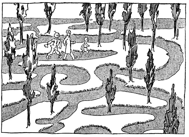 "What now?" groaned the statue dismally, clutching his umbrella. "Am I a bird? Why, Oh why did I ever leave my pedestal?" But wishing made no difference at all and down he dropped to the very bottom of no where. Then all at once he crashed through a crust of blue sky out into the blazing sunlight and thumped down in the middle of a broad green field. Luckily he landed upon his feet, but so hard and so heavily that he went down to his knees in soft earth. For a few moments he stood perfectly still. Then, closing his umbrella, he pulled one leg and then the other out of the mud and took a few steps to shake the stuff from his stone shins.