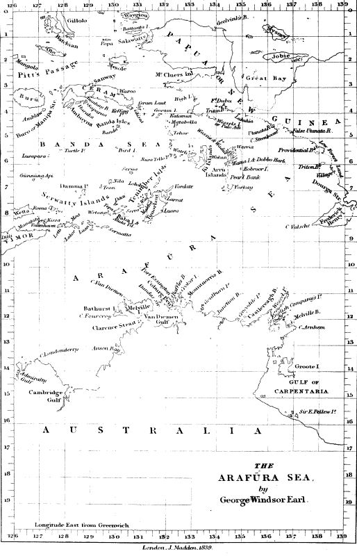 It was chiefly to establish an intercourse with the natives of these parts, by presenting to them a more convenient mart for their produce, that a British settlement was formed on Melville Island, near the coast of Australia, in 1824, by Captain, now, Sir J.J. Gordon Bremer, and if this, and the settlement subsequently formed at Raffles Bay, proved unsuccessful, it is more to be attributed to our want of information concerning these islands than to any other cause. Two small vessels successively were sent among them by the authorities of Melville Island, neither of which returned. It will be seen by M. Kolff's narrative, that, unhappily, both these vessels directed their course to parts previously unvisited by foreigners, and that the natives, unable to resist the temptation of acquiring more valuable property than they had ever before contemplated, attacked and plundered them, killing the greater portion of their crews. Had they visited the parts of these islands which were frequented by the traders, they might have done so with comparative safety, as the natives there would have been too well aware of the value of commerce to risk the danger of putting a stop to it by an action likely to draw upon them the vengeance of a powerful people.