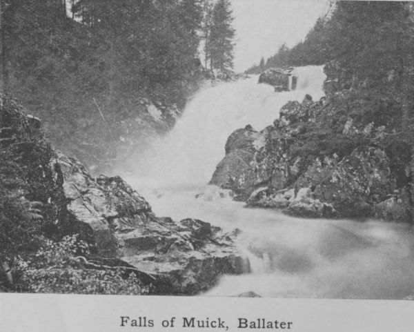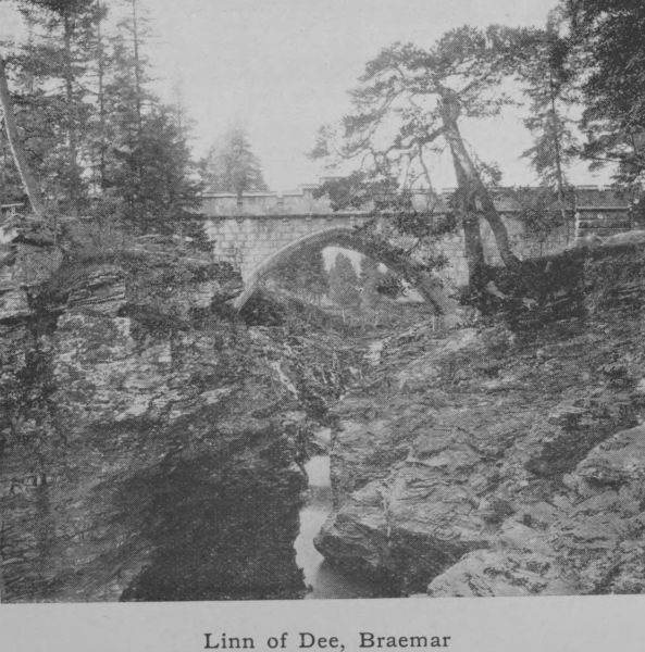 spacious hotels with electric light and all modern conveniences on a luxurious scale. Six miles distant is the famous Linn of Dee. The Duke of Fife’s Highland residence, Mar Lodge, as well as Mar Castle and Invercauld House, the home of the Farquharsons, are all in the vicinity. From Braemar the ascent of Ben-Macdhui is usually made, and sometimes also Loch-na-gar. A road leads from Braemar up the valley of the Clunie and over the Cairnwell to Blairgowrie. (pp. 8, 21, 22, 33, 66, 68, 75, 112, 161, 162.)