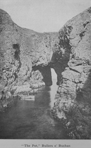 =Collieston= is a fishing village circling round a romantic bay near the parish church of Slains. Here in 1588 one of the ships of the Spanish Armada (_Santa Catherina_) was wrecked. The fishermen still call the creek St Catherine’s Dub. Several small cannon have been recovered from the pool. Eighty years ago, Collieston enjoyed a certain notoriety for smuggling, and the graveyard of Slains close by contains evidence of the deeds of violence that the contraband trade brought about. (pp. 38, 48, 54.)