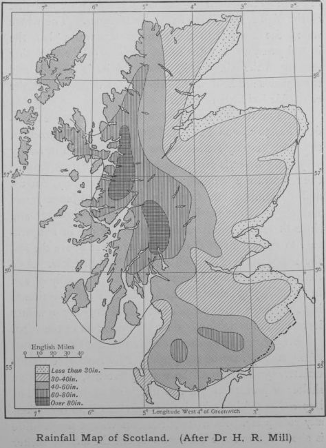 Being the only really large town in the county, and for that matter in the whole north of Scotland, it tends to grow in importance, and its business connections are ever extending. It is the focus of the trawling industry, and of the granite trade; while the agricultural interests of the county look to Aberdeen as their chief mart and distributing medium. Its secondary schools, its technical college, its agricultural college, its University, all help to swell its population by bringing strangers to reside within its boundaries. In itself it is clean, healthy and attractively built, while its fairly equable climate, its relatively low rain-fall (29 inches) and its equally low death-rate (14·2 per 1000) conduce[180] to its popularity as a residential town. Being the northern terminus of the Caledonian Railway, and having excellent service to London by the West Coast, the Midland, and the East Coast routes, it obtains a large share of the tourist traffic; and the sportsmen who fish in the Aberdeenshire rivers or shoot grouse in the Aberdeenshire moors must all do more or less homage to the county town.