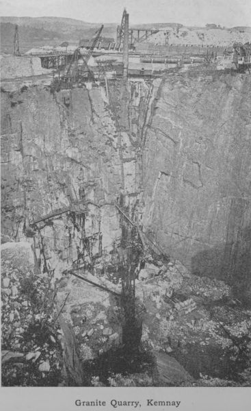 =Kemnay= (948), about five miles up Donside from Kintore, is well known for its extensive granite quarries, which sent stones to build the Forth Bridge and the Thames Embankment. Near it is Castle Fraser, one of the finest inhabited castles of the county. Fetternear, once the county seat of the bishops of Aberdeen, is on the opposite side of the river. (p. 83.)