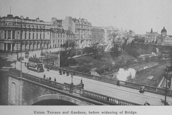 The chief street of the city is Union Street created a century ago at a cost which was considered reckless at the time but which has been more than justified by the results. This first improvement scheme, which has been followed up by others in recent times, was the work of men with a wide outlook. Prominent among the Provosts of enlightenment was Sir Alexander Anderson, whose name is now at the eleventh hour stamped in memory by the Anderson Drive—a fashionable west-end thoroughfare. Union Street is the backbone from which all the other thoroughfares radiate. It is broad and handsome and the buildings that face each other across it are as a rule worthy of the street. Union Bridge, one of Fletcher’s graceful structures, with a span of 130 feet, makes a pleasing break in the line of buildings and permits a view north and south along the Denburn valley. The northern view, which shows Union Terrace and Union Terrace Gardens with handsome public buildings, both in the foreground and in the background, is undoubtedly one of the finest in the city. The Duthie Park on the north bank of the Dee, the links that fringe the northern coast, the picturesquely wooded amenities of Donside, above and below Balgownie Bridge, the quaint other world air of Old Aberdeen with its lofty trees, its grand cathedral and the ancient crown of King’s College, these are all elevating and meliorating influences that help to keep in check the commercial spirit that rules about the harbour-quays and the fish-market.