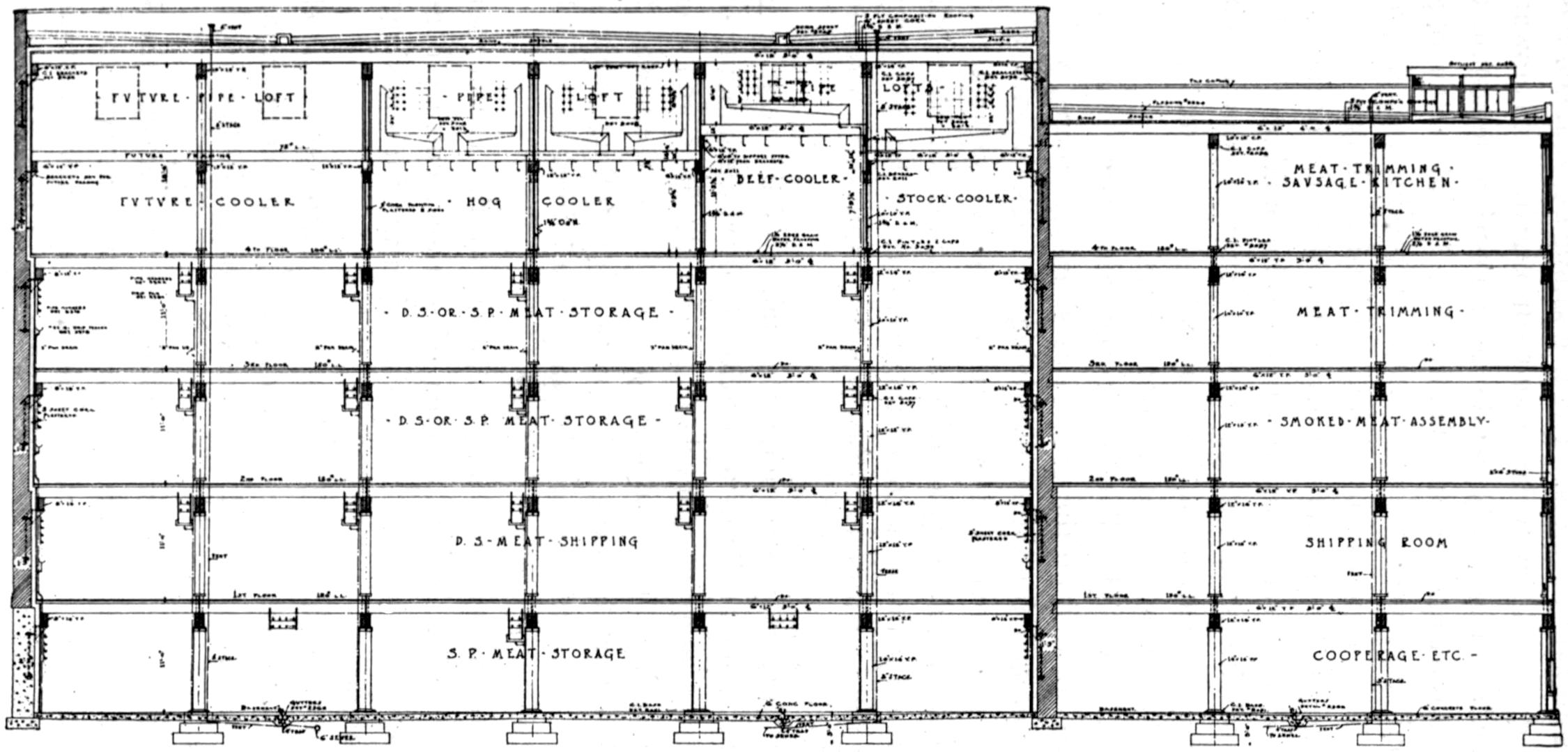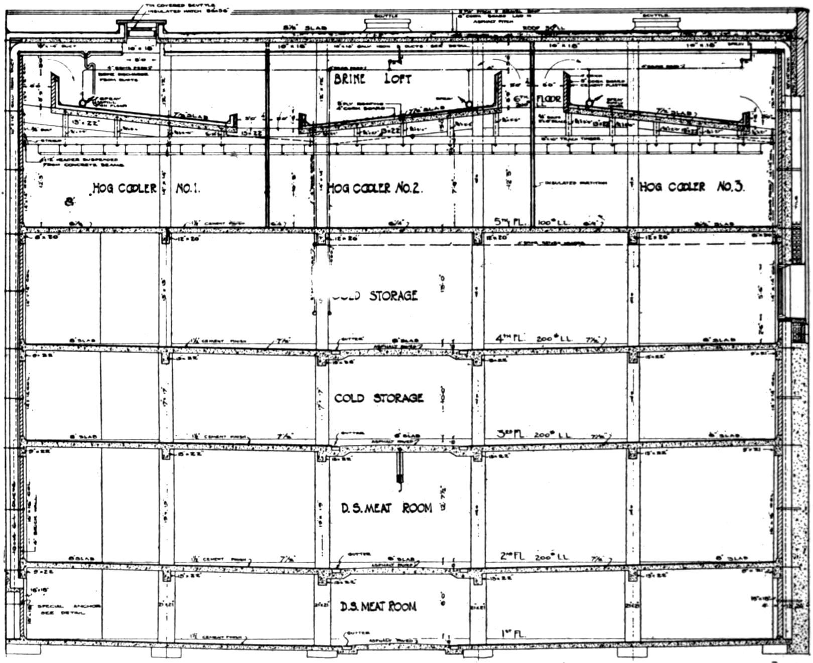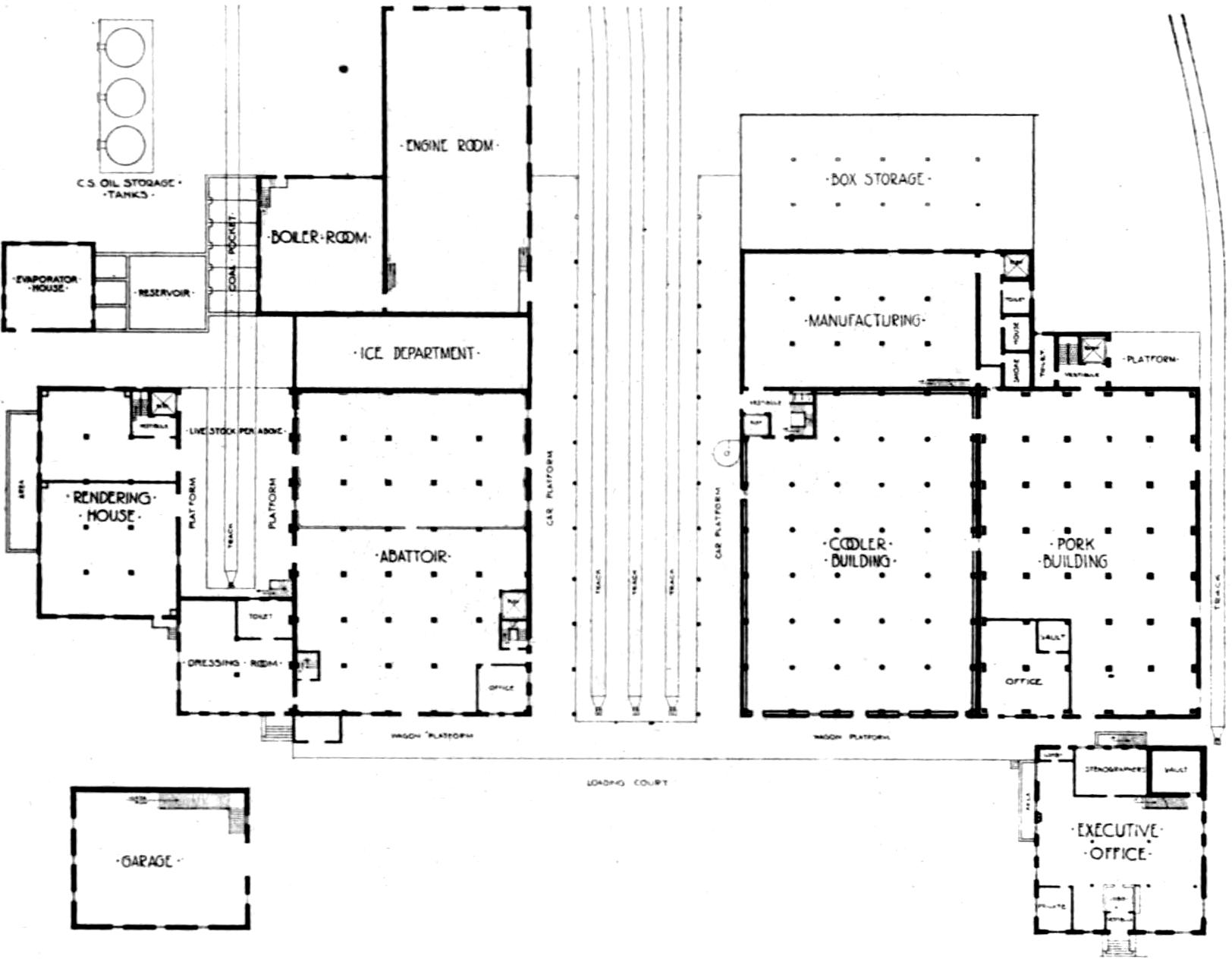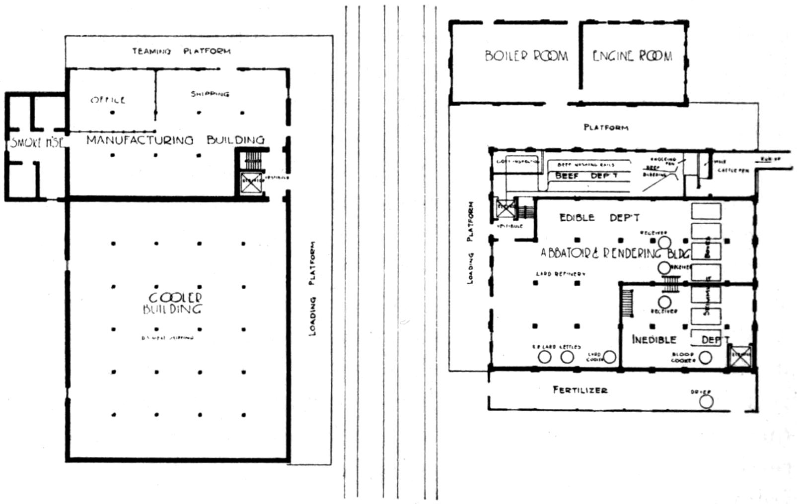 | Description of Plants — Plant No. 1 — Plant No. 2 — Plant No. 3 — Plant No. 4 — Type of Plant — Loading Facilities — Producing Department — Abbatoir Building — Rendering Building — Live Stock — Icing Department — Cooler Building — Pork House — Manufacturing Building — Salt Spaces — Power Department — Gravity System — How to Build — Fireproof Design — Advantages — Slow Burning Construction — Approval of Plans. | |