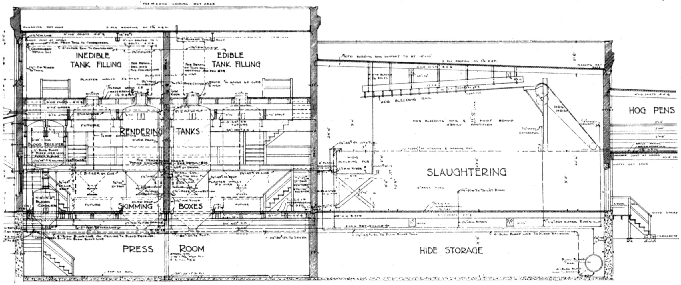 | Bone Department — Hard Bone — Glue Bone — Bone Products — Horns — Manufactured Articles — Skulls — Test Yield from Skulls and Feet — Buttocks and Thighs — Blades and Ribs — Drying — Crushed Bone — Grinding Bone — Neats Foot Oil Storage — Neats Foot Oil Purifier — Yield Tests. | |