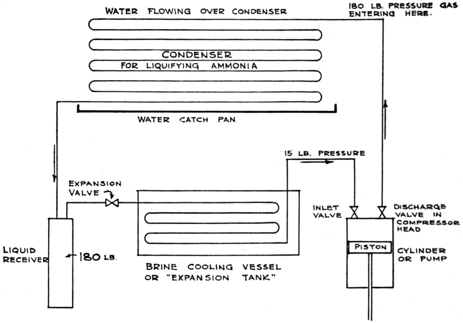 | Ammonia Machines — Ammonia — Compressor — Condenser — Receiver — Cooler — Condensing Water — Unit Basis — Computing from Unit Basis — How Rated — Freezer Requirements — Freezers in Small Plants — Cylinder Arrangement — Why Brine Circulation — Air Circulating — Force Draft — Coil Room Systems — Brine Chilling — Brine Methods — Types of Brine Coolers — Balanced Brine System — Direct Expansion — Two Stage Compressors. | |