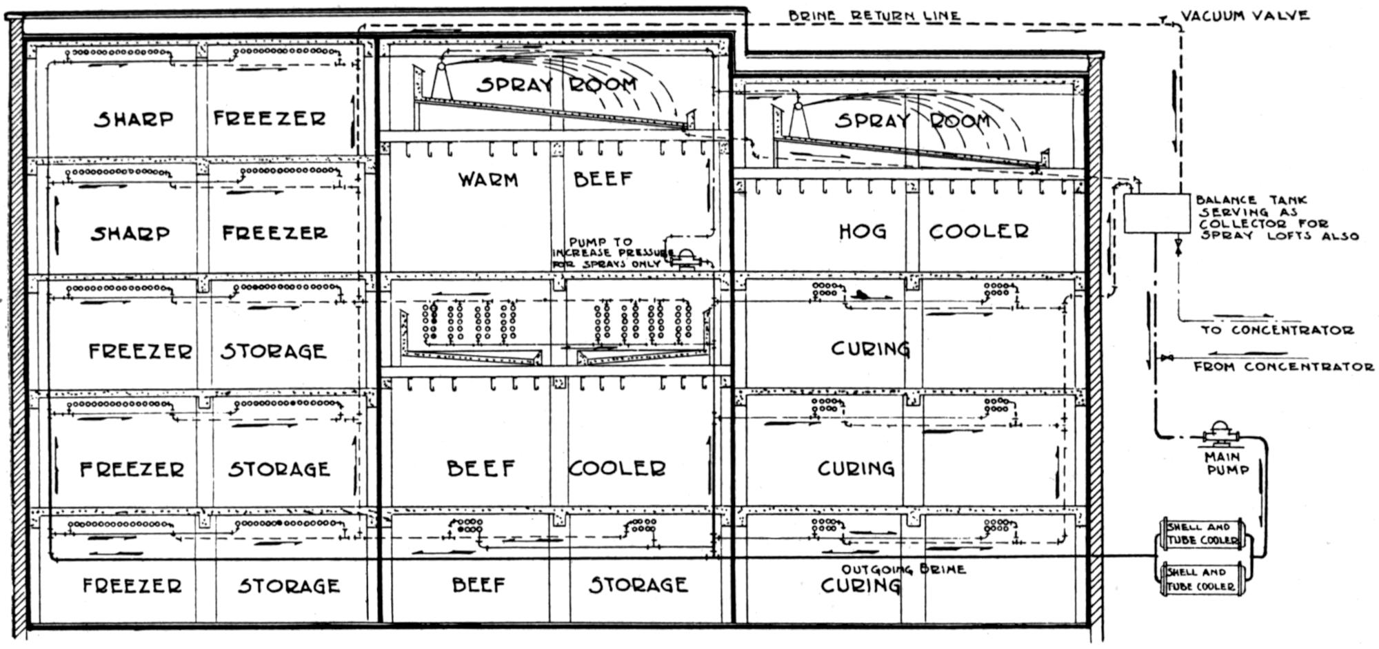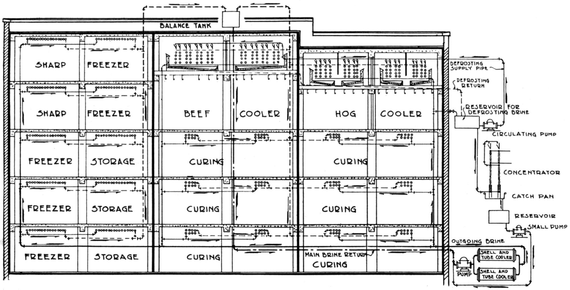 | Refrigeration — Necessities — Ice Plants — Natural Ice — Chilling — Quantity Refrigeration to Provide — Space Per Ton Machine — Machinery Per Head — For Cooled Meats — Ice Computation — Compressor Capacity — Chilling Lard — Summary Computations — Low Temperature Brine System. | |