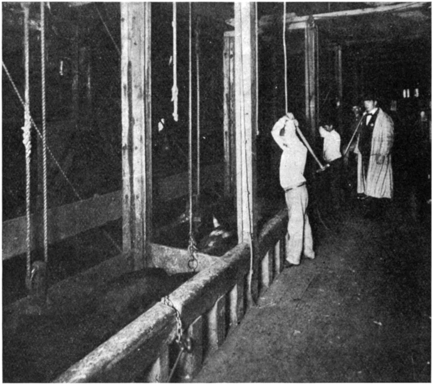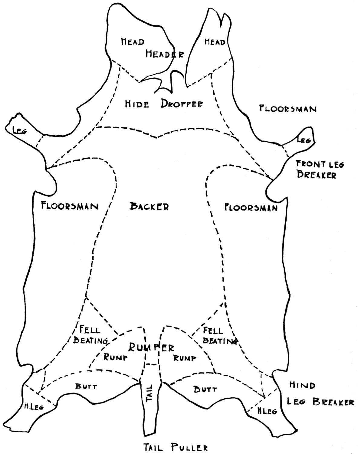 | Receiving Live Stock — Watering — Driving Cattle — Knocking Cattle — Sticking — Heading — Pritch Sticks — Foot Skinning — Ripping and Leg Breaking — Flooring Cattle — Breast Sawing — Fell Cutting — Rumping — Beef Spreaders — Fell Beating — Gutting — Backing — Tail Sawing — Splitting — Splitting Cleavers — Clearing Out and Hide Dropping — Neck Splitting — Bruise Trimming — Skirt Trimming — Washing Cattle — Fountain Brushes — Dressing Cattle — Conveyors. | |