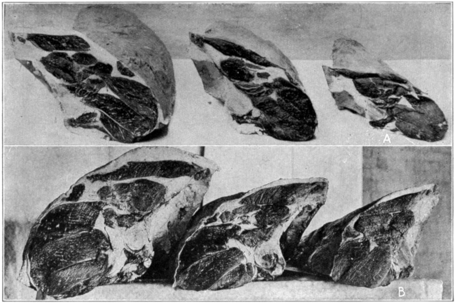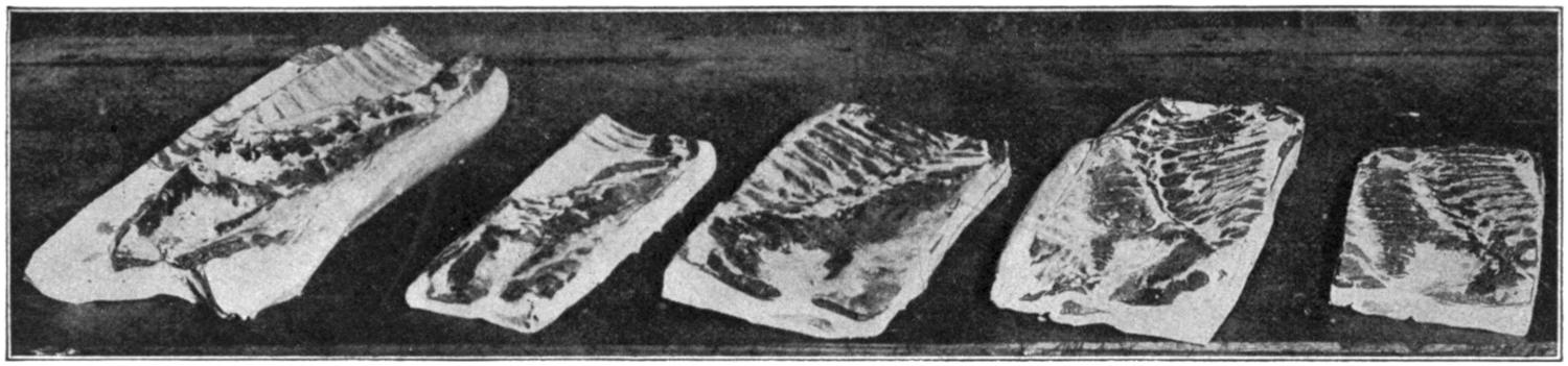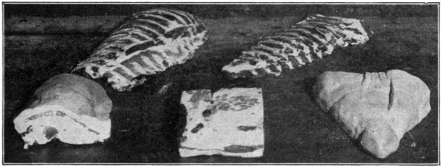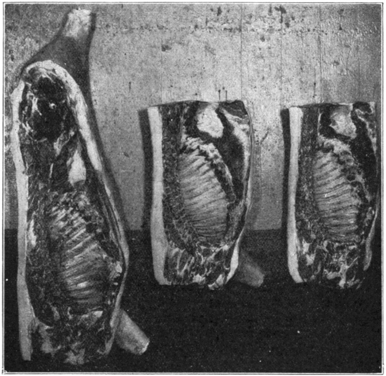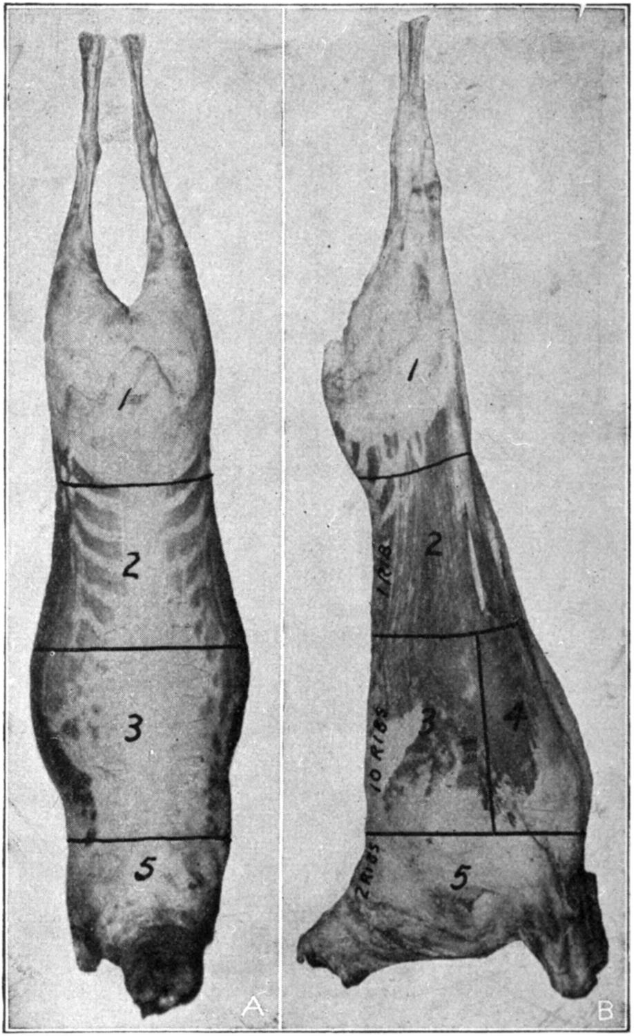 | Yields of Cattle — Yield from Twenty-two Native Cattle — Yield from Fifty-nine Texas Cattle — Yield from Twenty Heavy Cattle — Yield from Thirty-four Cattle — Percentage of Various Cuts — Beef Cuts — Diagram of Cutting — Grading — Loins — Ribs — Rounds — Chucks — Plates, Shanks and Flanks — Barreled Beef. | |