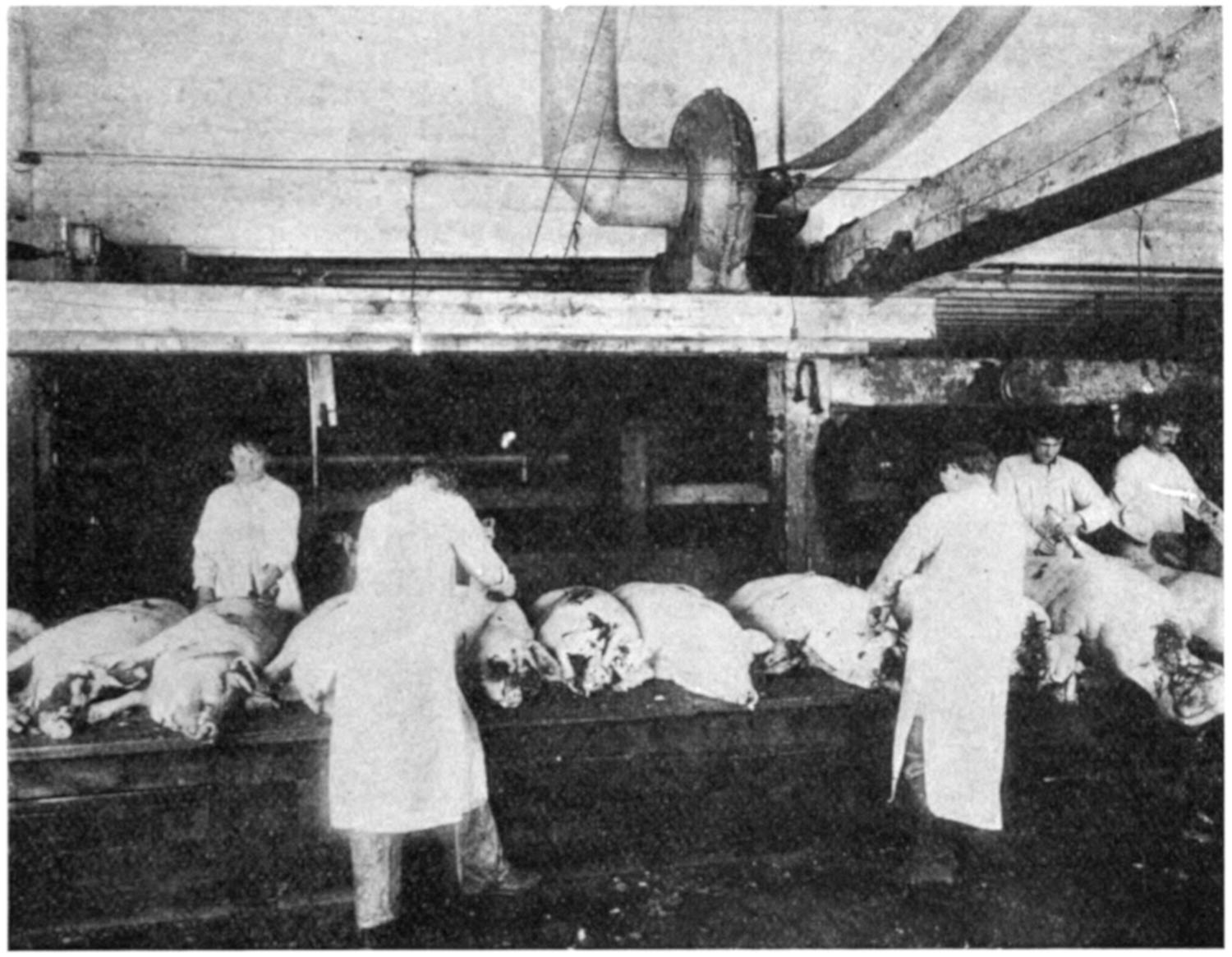 (12) Hog Cutting.—To begin with the receipt of pigs at cooler. To cut pigs into various parts and dispose of said parts. Sausage department, lard refinery, rendering department[458] or to curing cellars. Includes packing of any and all cut meats for disposal for sale.