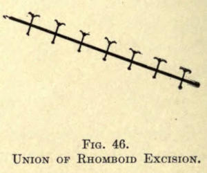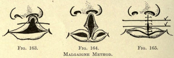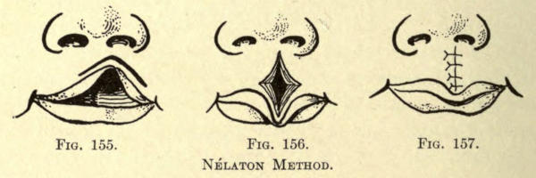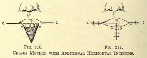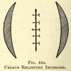 Some scars, the resultant of negligent coaptation, are to be excised according to the Celsus method and are brought together with a number of fine silk sutures.