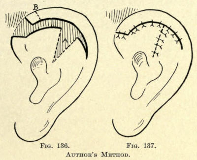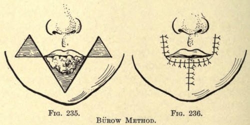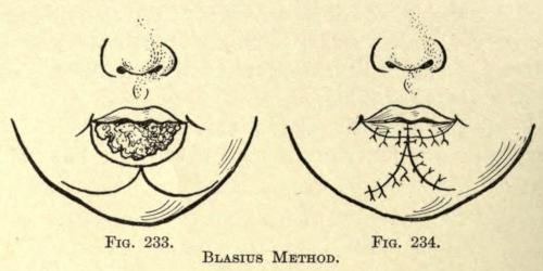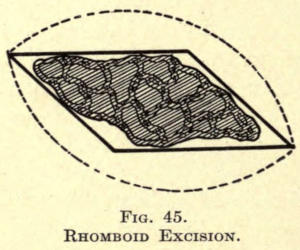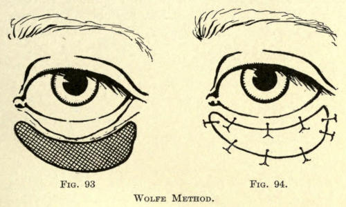 Not infrequently the cosmetic surgeon is called upon to remove or improve unsightly scars about the face,[486] the result of injuries or burns and after the careless coaptation of such wounds. The scars vary in extent and degree, from a mere pit due to varicella or variola to the broad areas following the cicatrization of lupus and burns. Surgical scars vary also from a mere line to areas of greater or less extent, dependent upon the ablation of neoplasms or the granulation of wounds due to any cause.
