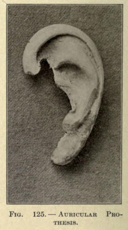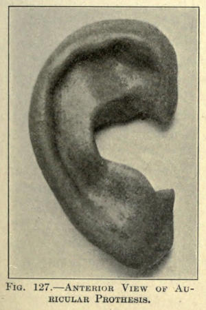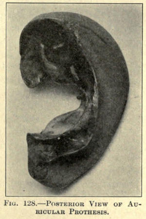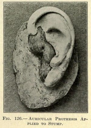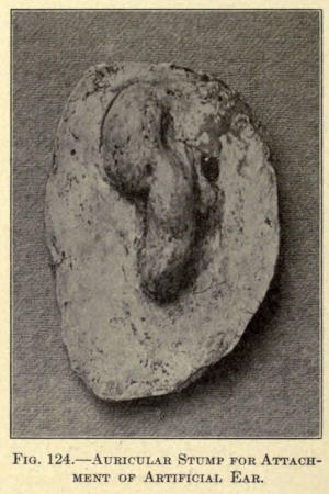 In molds of the ear an anterior and posterior impression should be made, if a cast of the entire organ is desired. This can be done by first applying a layer of plaster to the posterior surface up to the outer rim, allowing this to harden and painting the anterior ear and the exposed plaster border with petrolatum before putting the plaster over it. Upon traction, when set, the plaster will separate readily at the point of the separation.