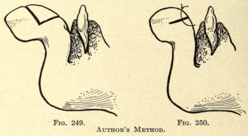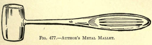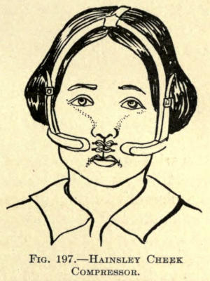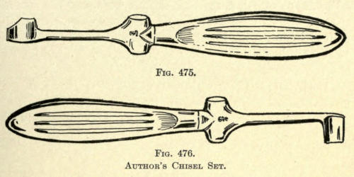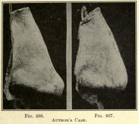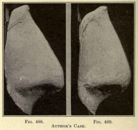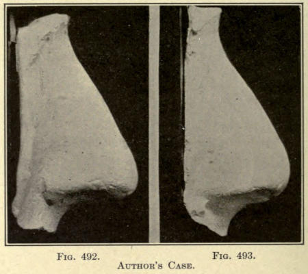 The author advises the addition of a small quantity of Armenian bole to the plaster used for the cast, as it gives a less ghastly tint and aids much by its color in the cutting away of the white mold from the cast. Several of these casts, taken before and after operation by the author, have been shown in the preceding chapters.
