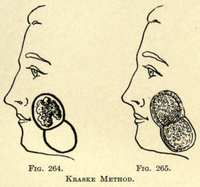 The pits, if spread about the face promiscuously, may be treated separately by the peeling method, but when[489] they lie less than one inch apart, it is best to treat the skin of the whole face.