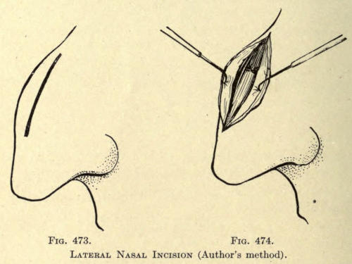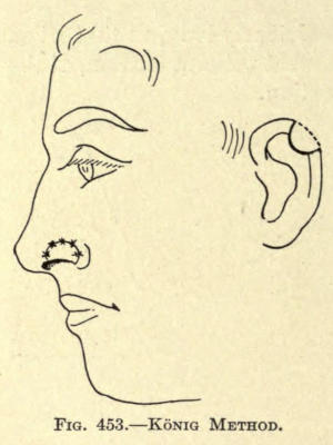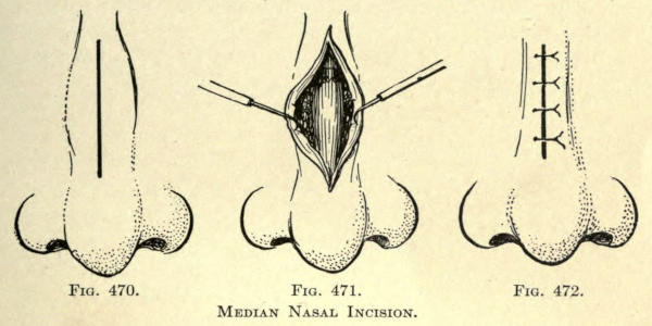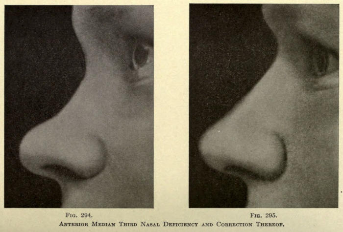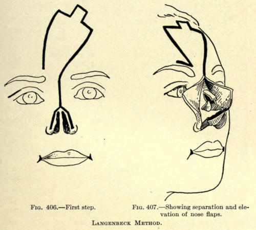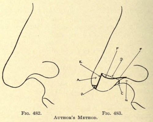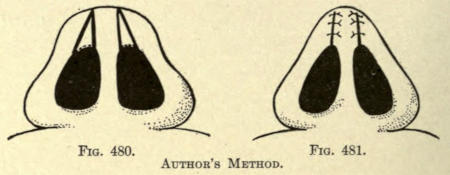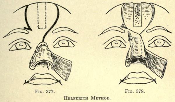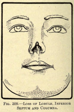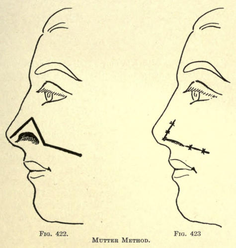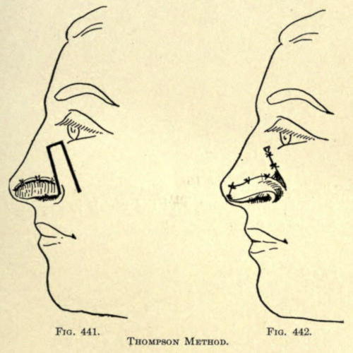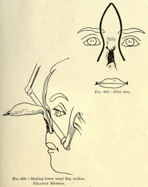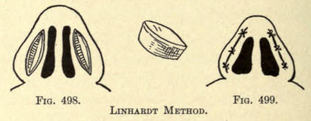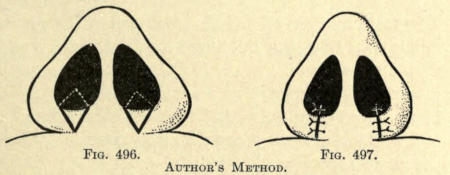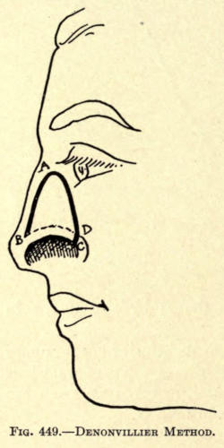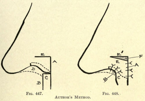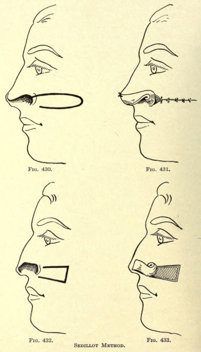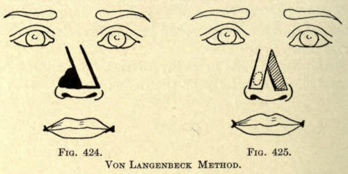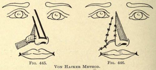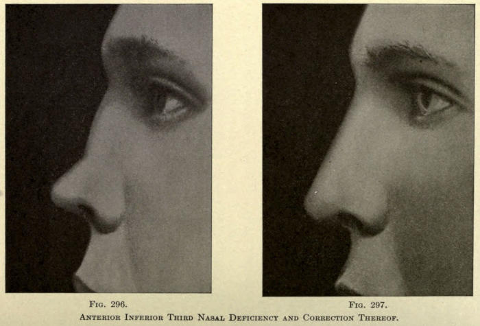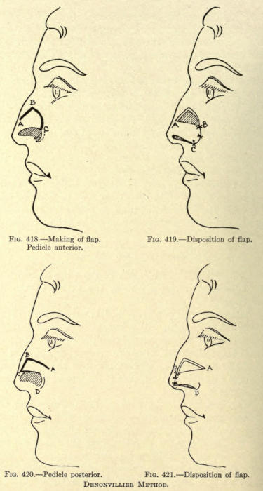 | Angular nasal deformity—Correction of elevated lobule—Correction of bulbous lobule—Angular excision to correct lobule—Correction of malformations about nasal lobule—Deficiency of nasal lobule—Correction of widened base of nose—Reduction of thickness of alæ—Correction of nasal deviation—Undue prominence of nasal process of the superior maxillary | 448 |