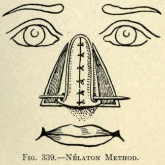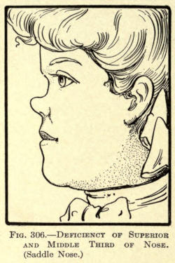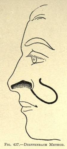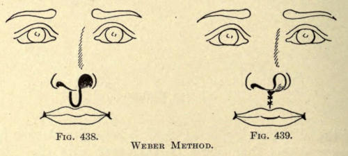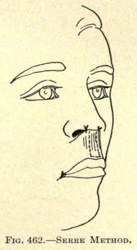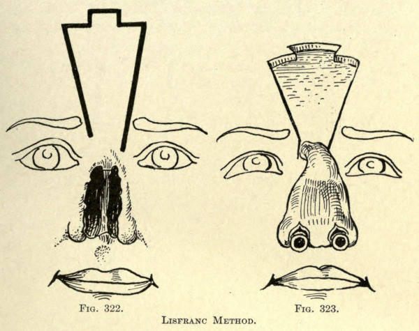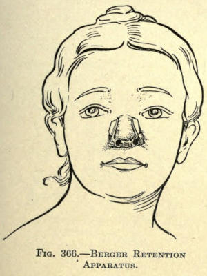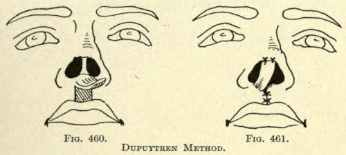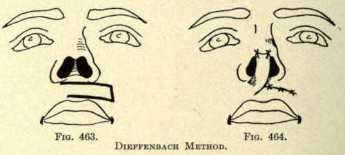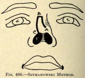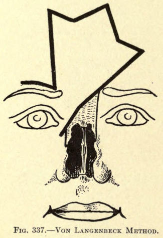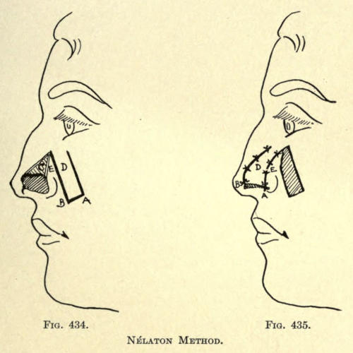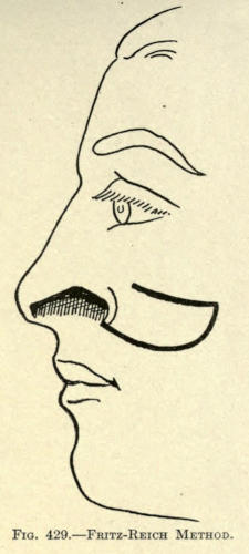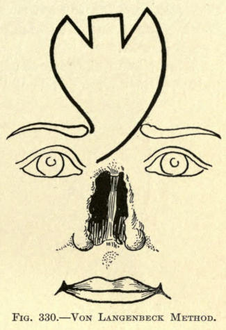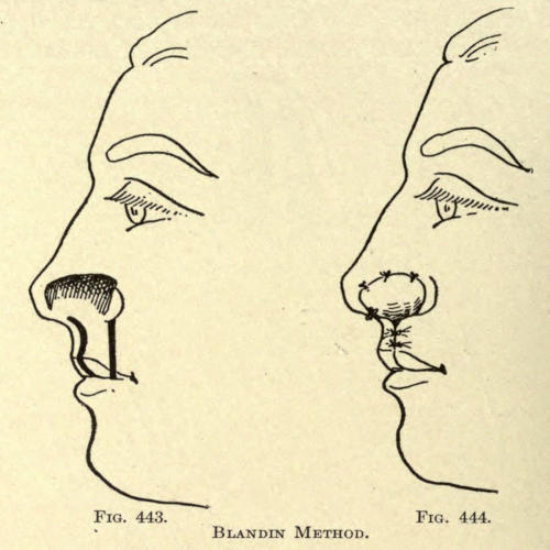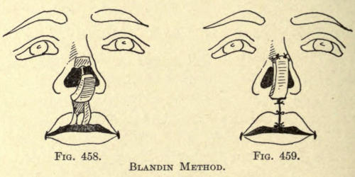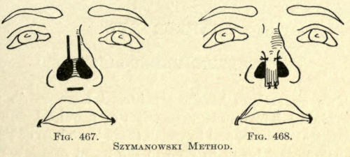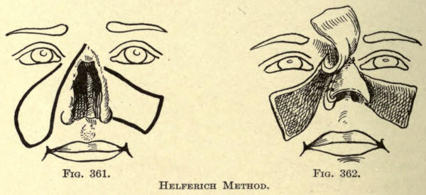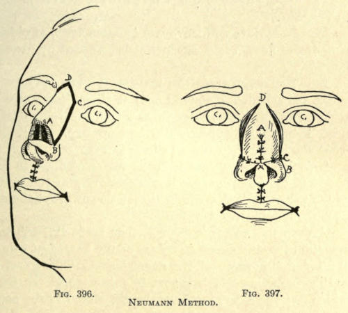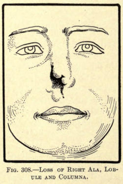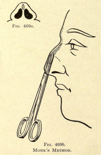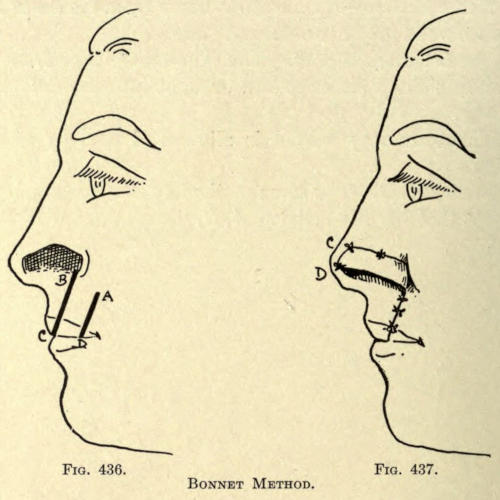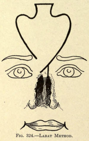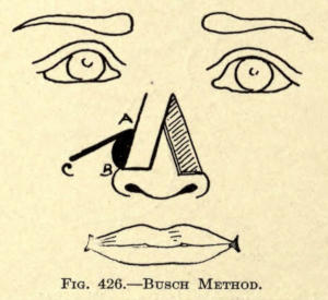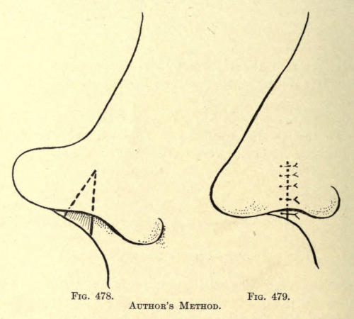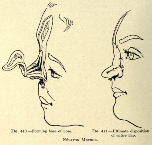 | Angular nasal deformity—Correction of elevated lobule—Correction of bulbous lobule—Angular excision to correct lobule—Correction of malformations about nasal lobule—Deficiency of nasal lobule—Correction of widened base of nose—Reduction of thickness of alæ—Correction of nasal deviation—Undue prominence of nasal process of the superior maxillary | 448 |