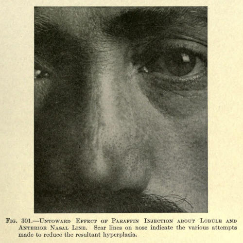 | Indications—Precautions—The advantage of the method—Untoward results: Intoxication; Reaction; Infection; Necrosis; Sloughing; Sloughing due to pressure; Subinjection; Hyperinjection; Air embolism; Paraffin embolism; Primary diffusion or extension of paraffin; Interference with muscular action of the wings of the nose; Escape of paraffin after withdrawal of needle; Solidification of paraffin in needle; Absorption or disintegration of the paraffin; The difficulty of procuring paraffin with proper melting point; Hypersensitiveness of skin; Redness of the skin; Secondary diffusion of the injected mass; Hyperplasia of the connective tissue following the organization of injected matter; Yellow appearance and thickening of the skin after organization of the injected mass has taken place; The breaking down of tissue and resultant abscess due to the pressure of the injected mass upon the adjacent tissue after the injection has become organized—The proper instruments for the subcutaneous injection of hydrocarbon protheses—Preparation of the site of operation—Preparation of the instruments for operation—The practical technique—Specific classification for the employment and indication of hydrocarbon protheses about the face—Specific classification for the employment and indication of hydrocarbon protheses about the shoulders, etc.—Specific technique for the correction of regional deformities about the face: Transverse depressions; Deficient or receding forehead; Unilateral deficiency; Interciliary furrow; Temporal muscular deficiency; Deformities of the nose; Deformities about the mouth; Deformities about the cheeks; Deformities about the orbit; Deformities about the chin; Deformities about the ear—Specific technique for the correction of deformities about the shoulders | 209 |