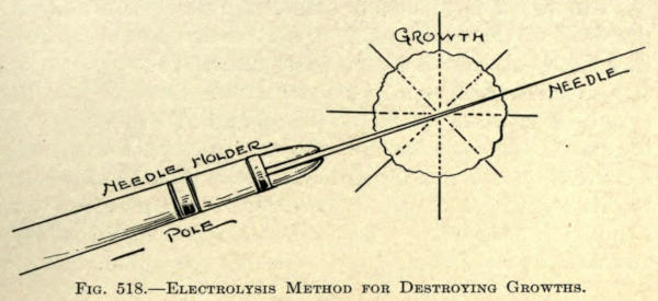 The treatment of scars depends upon their size and location. A mere linear scar may be reduced by electrolysis, the needle, negative pole, being introduced equidistantly, from one sixteenth to a quarter inch apart, with the hope of causing a breaking down electro-chemically of the scar itself and waiting for secondary cicatrization. In other words, making a scar within a scar.
