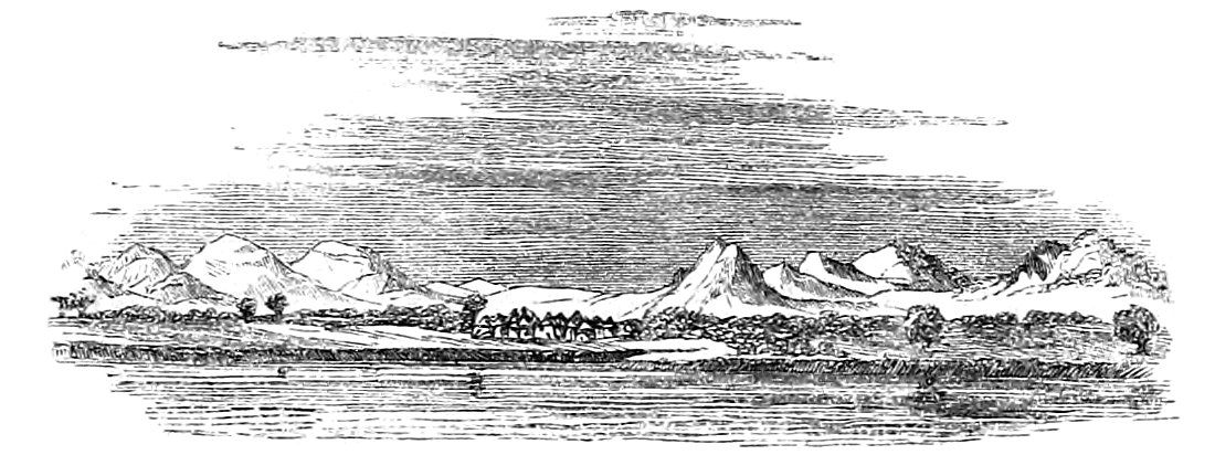 We landed soon afterwards on the right shore, as the nearest landing-place to the capital, Belènja, on the mountain of the same name, which was at some distance. They gave us the names of all the mountains lying around in the horizon. The river flows here from S.S.W., or rather the right shore has this direction. To N. by W. Mount Nerkonji, previously mentioned as Niakanja, long seen by us; to W. by S., Mount Konnobih; behind it, in the far distance, the mountain-chain of Kugelù; to S.W., the rocky mountain, Korek; behind which the before-named mountain-chain still extends, and is lost in misty heights. These do not appear, indeed, to be of much greater height; but on a more accurate observation, I distinguished a thin veil, apparently sunk upon them, clearer than the western horizon, and the blue of the mountain forms vanishing from Kugelù to the south. As I once looked for the alpine world from Montpellier, and found it, trusting to my good eye-sight, so now I gazed for a long time on this region of heights; their peaks were clearly hung round with a girdle of clouds, apparently shining with a glimmering light in opposition to the clouds hanging before them in our neighbourhood. When I view the long undulating chain of Kugelù, distant at all events, taking into consideration the clear atmosphere, more than twenty hours behind Konnobih (some twelve hours off), the highest summit of which, west by south,[24] without losing its horizontal ridge, disappears first evidently in the west, and is completely veiled behind Korèk lying nearer over south-west, I conceive that this Kugelù well deserves the name of a chain of mountains, even if we only take the enormous angle of the parallax at twenty hours’ distance.