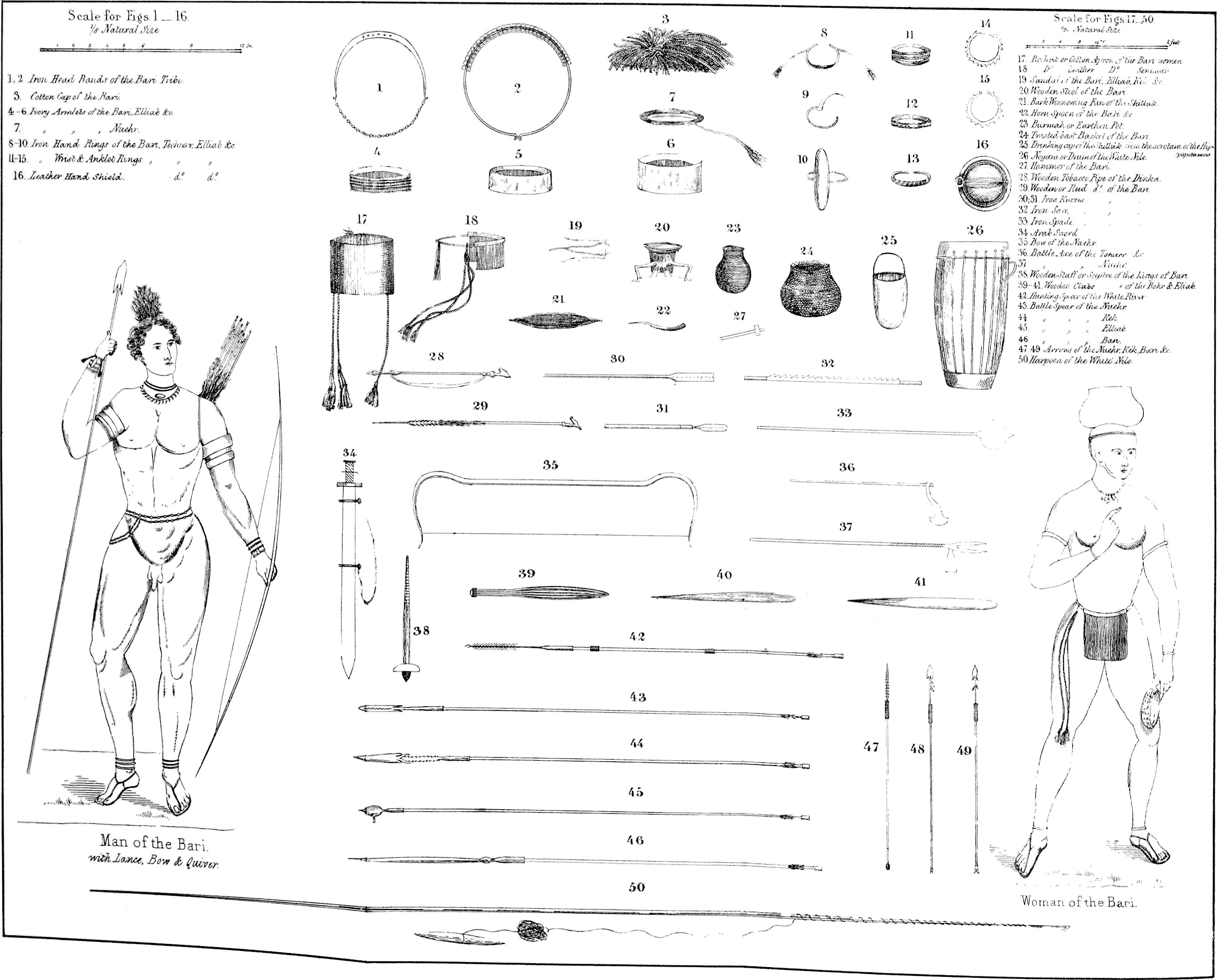 I am led to this latter supposition from a couple of women having previously tried the skin on my face with their wet fingers, to see if it were painted. The features and form of the head are quite regular among these gigantic people, and are a striking contrast to those of our black soldiers, with their more negro-like physiognomy, although they are not, on the whole, ugly. I compare the true Caucasian races, who are present, with these men, and find that the latter have a broader forehead. The inhabitants of the kingdom of Bari might be designated a protoplasma of the black race; for not only do they shoot up to a height of from six and a half to seven Parisian feet,[1] which we have seen also in the other nations, but their gigantic mass of limbs are in the noblest proportions. The form of the face is oval, the forehead arched, the nose straight, or curved, with rather wide nostrils,—the alæ, however, not projecting disagreeably; the mouth[29] full, like that of the ancient Egyptians; the orifice of the ears large, and the temples a little depressed. The last we do not find in the Baràbras, and the races akin to them in Abyssinia. The men of Bari have, besides, well-proportioned legs, and muscular arms. It is a pity that they also extract the four lower incisors, for not only is the face disfigured by this custom when they are laughing, but their pronunciation also becomes indistinct. They differ, moreover, from the nations hitherto seen by having no holes in their ears for ornaments; and they do not tattoo themselves. Yet I remarked some who had incisions, as imaginary ornaments, on their shoulders: such exceptions may originate from the mothers being of another race. I have even seen in the land of Sudàn instances of a twofold genealogical table in the countenance, because the father and mother were of different nations. There appears to be no national custom with respect to wearing the hair long or short; but generally the hair is short, and not more woolly than that of the Baràbras and Arabs. On some there was none to be seen, and it appears either to be removed by a knife or a cauterising process, such as the women in the harìm use for other parts. Some wear their hair like a cock’s comb from the forehead down to the nape of the neck; others have scarcely the crown of the head covered: the most, however, wear tolerably long hair, in the natural manner, which gives a significant look to many faces. Their good-natured countenances correspond also to their jokes among themselves, which are, perhaps, occasionally directed against us. I have never been able to discover in the whole journey their reverence for our[30] race and the god-like descent, much as this was asserted by Thibaut, who was with the first expedition.