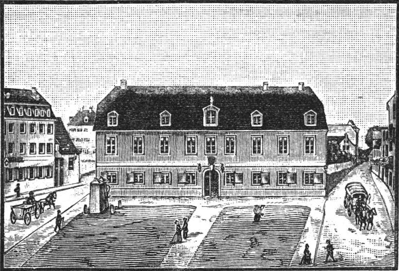 Die Petersstraße, damals noch ziemlich still, da sich die Hauptgeschäfte Leipzigs mit Ausnahme des von Gustav Steckner, in der Grimmaischen Straße befanden,[S. 10] zeigte eine Menge ebenfalls sehr alter und großer Gebäude auf. Da war zunächst der »Hirsch« an der Ecke der Magazingasse, dann »Stadt Wien«, halb Hotel, halb Oekonomiehof, bei dessen im Zickzack angelegten Durchgange nach der Schloßgasse man über Pfützen, Löcher und Dunghaufen steigen mußte, dann das finstere alte »Juridicum« mit seiner Halle und der im Hofe befindlichen altberühmten Kitzing und Helbigschen Restauration, dann die »drei Könige« und der »goldene Arm«, alles seitdem umgebaute Häuser. In der Magazingasse stand rechts am Petersthore die thurmlose alte Peterskirche und an der Ecke des Neumarktes der alte Rathsmarstall, ebenfalls ein uralter baufälliger Oekonomiehof, dessen Hauptsehenswürdigkeit ein riesiger Dunghaufen in der Mitte des durch zwei große Scheunenthore nach dem Neumarkt und der Magazingasse zu abgeschlossenen Hofes bildete. In der Universitätsstraße stand rechts neben dem »Bär« das alte rußgeschwärzte »Lutherhaus«. Vom Café Francais resp. Grimmaischen Thor bis zum Eckhaus der Universitätsstraße erstreckten sich die erst 1846 weggerissenen sogenannten Colonaden, die übrigen Straßen und Gäßchen der inneren Stadt haben sich bis auf verschiedene Um- und Neubauten von Häusern nur wenig verändert. Als im Jahre 1845 der Markt neu gepflastert wurde, pflasterte man auch das noch jetzt zu sehende Wappen der Stadt mit farbigen Steinen in die vor dem Rathhausdurchgang befindliche Marktfläche. Am Ende des Brühls nach Osten lag das alte »Georgenhaus«, ein altes finstres burgähnliches Gebäude, welches die Wohnstätte der »Versorgten«, aber auch ein Krankenhaus für Sieche und besonders Irrsinnige, sowie das Waisenhaus enthielt. Ueber seinem Eingangsthore befand sich die Legende des mit dem Drachen kämpfenden Ritters St. Georg in Stein gehauen. Dem Georgenhaus gegenüber, an der Ecke der Ritterstraße lag die[S. 11] »alte Heuwaage«, gewissermaßen eine Copie der damals noch mit einem Treppenthurm versehenen »alten Waage« am Marktplatz.