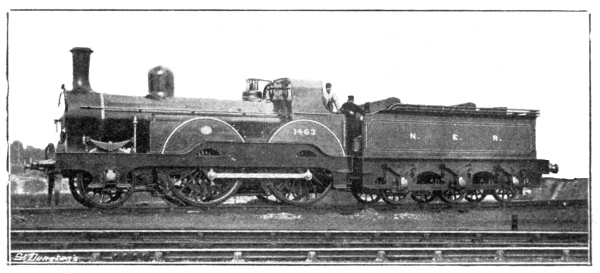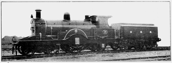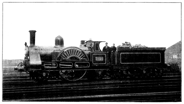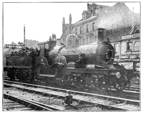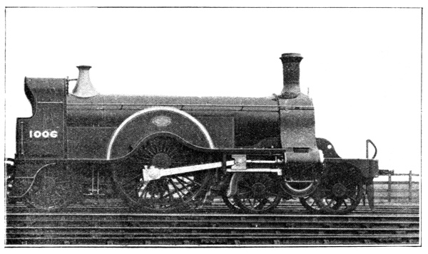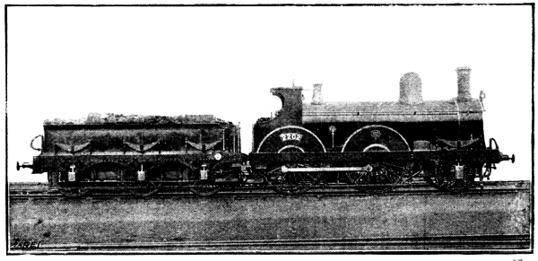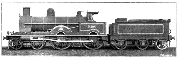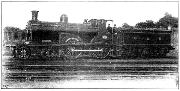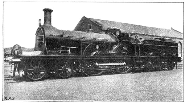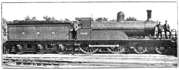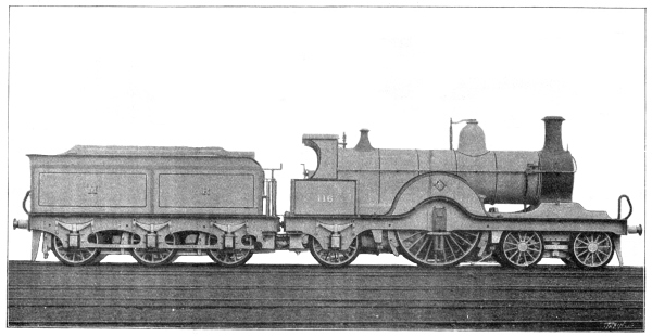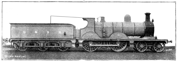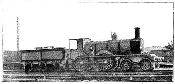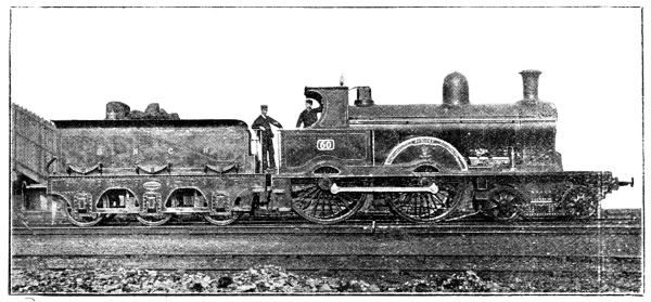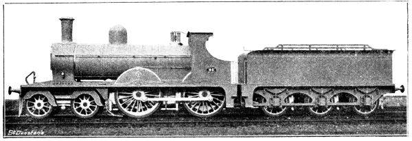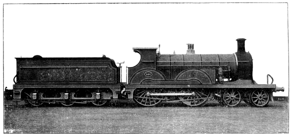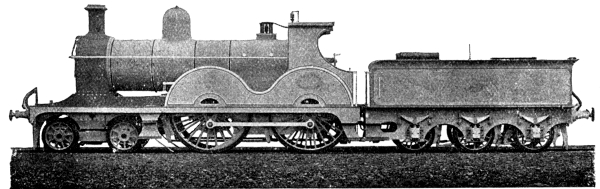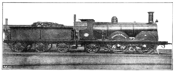 “Jubilee” (Fig. 143) is also a compound express passenger engine of the same railway. Both these engines were designed by Mr. B. Malcolm, the Company’s locomotive superintendent. The modern passenger engines on the Great Northern Railway (Ireland) are of the four-coupled type, with a leading bogie, and are known as the “Rostrevor” class. The leading dimensions are as follows:—