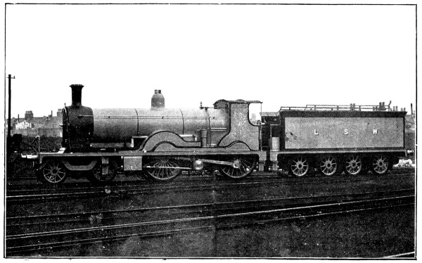 Fig. 141 represents one of the Highland Railway’s 10-wheel main line engines, with outside cylinders. The six-coupled wheels make this design [Pg 316] to be well adapted for the heavy traffic of the system, whilst the leading bogie gives sufficient facility for easily negotiating the curves of the Highland Railway.