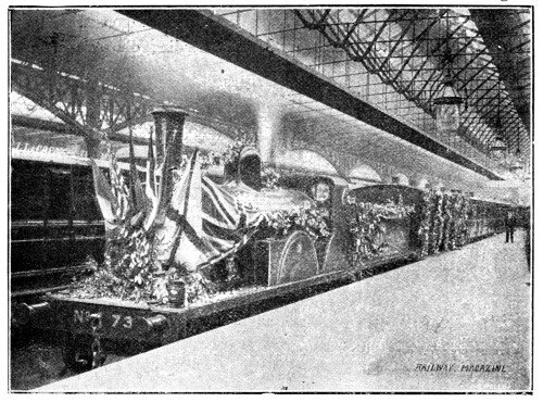 Fig. 144 represents one of the engines of the Great Northern (Ireland) Railway, as decorated to haul the Duke of York’s train during his recent visit to Ireland.