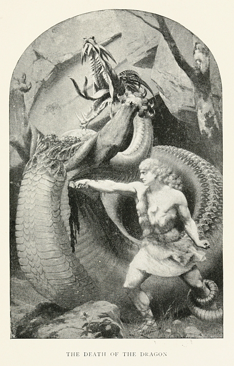 Siegfried, son of Siegmund and Sieglind, woos Kreimhild, the sister of King Gunther, of Burgundy, promising, in return for her hand, to aid Gunther in winning Brunhild, Queen of Issland (Iceland). Siegfried, with the help of his cloud-cloak, conquers Brunhild for Gunther—first in three athletic games, which she makes a test for all suitors; and later when, after the marriage, she proves stormy and untamed. He takes her Ring and girdle, and gives them to his wife, Kreimhild. They possess magic properties, and Brunhild, when deprived of them, loses her great power and becomes like any ordinary woman. She sees her Ring on Kreimhild’s hand one day, and, realizing that it is Siegfried, and not her husband Gunther, who has conquered her great strength and stolen her magic circlets, she tells her wrongs to Hagan, who promises revenge. Hagan is the Knight of Trony, and he and his brother Dankwort are Gunther’s vassals.-xi- Hagan entices Kreimhild to reveal to him the secret of her husband’s safety in battle, and she tells him that Siegfried once slew a dragon and bathed in the blood, which made him invulnerable, save in one place, between his shoulders, where a leaf fell, protecting the skin from the blood. Kreimhild is entirely deceived by Hagan, and, not suspecting his treachery, she sews a circle of silk upon her husband’s vesture over the vulnerable spot, that Hagan may better know how to protect the hero’s one weakness when they are in battle. It is there, where the circle of silk is sewn, that Hagan stabs him.