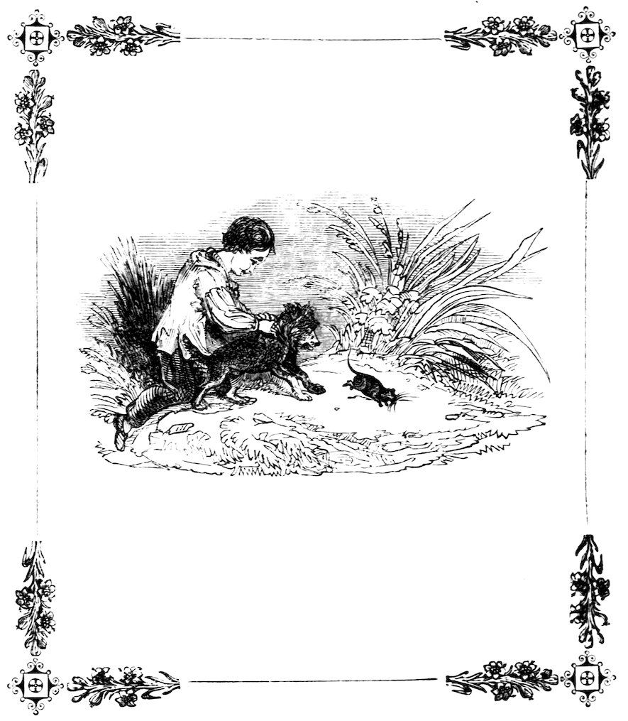 25Just then a small brown mouse came out of his hole, and ran away very fast. Frank was a kind boy, and would not let Dash run after it and kill it, as he wished. He held his dog tight, and sat down near the spot, to see if the mouse would come back; but as it did not, he ran in-doors to tell his mamma what he had seen.