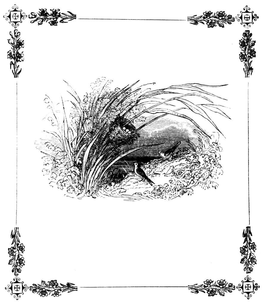 “Then you thought wrong,” said James: “but if you can be still, I will tell you what it was. While I stood here with 53you I heard such a strange chirp, and as I did not know what bird’s note it was, I thought I would try and find the nest, (not to touch it or take the eggs, of course, but just to have a look at it.) So I crept in very still, and went to the place from whence the sound came. In a short time I was close to it, and there I saw such a sweet little nest! it was made of the dead leaves of the rush and sedge, and a few pieces of dry grass, and lined with the soft tops of the reed. And, oh, Jesse! I wish you could have seen the eggs; 54there were six of them, white, with small red spots all over; such tiny things! On the stem of a reed, close by the nest, was the hen-bird, and her mate was not far off; but the noise you made drove them away.”
