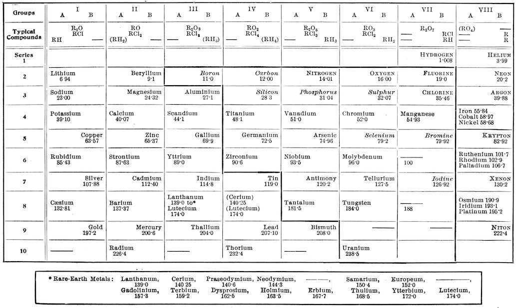 The chemist and the physicist, often working together in the investigation of the problems lying between their two departments, have accumulated a staggering array of new facts from which the principles of their sciences have been deduced. Many new elements have been discovered, in fact nearly all called for by the periodic law; the so-called fixed gases have been liquefied, and now air in liquid form is almost a plaything; the absolute zero has been nearly reached in the boiling point of helium; physical measurements in great precision have been carried out in both directions for temperatures far beyond any scale that was early conceived possible; the atom, once supposed to be indivisible, has been shown to be made up of the much smaller electrons, while its disintegration in radium and its derivatives has been traced out and with consequences only as yet partly understood but certainly having far-reaching consequences; at one point we seem to be brought near to the transmutation of the elements which was so long the dream of the alchemist. Still again photography has been discovered and perfected and with the use of X-rays it gives a picture of the structure of bodies totally opaque to the eye; the same X-rays seem likely to locate and determine the atoms in the crystal.