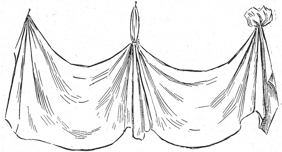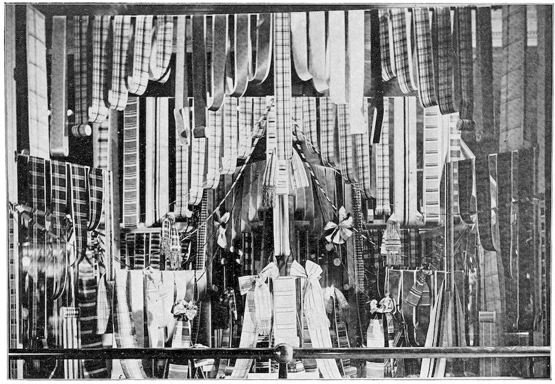 RIBBON DISPLAY, DRAPED OVER CURTAIN POLES, WITH BOLTS AT THE BOTTOM OF EACH PIECE.—Ross.