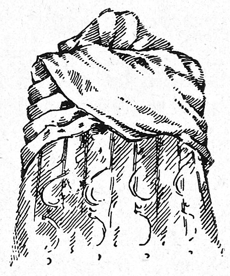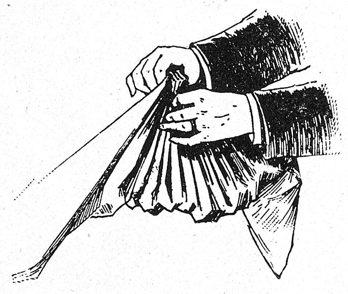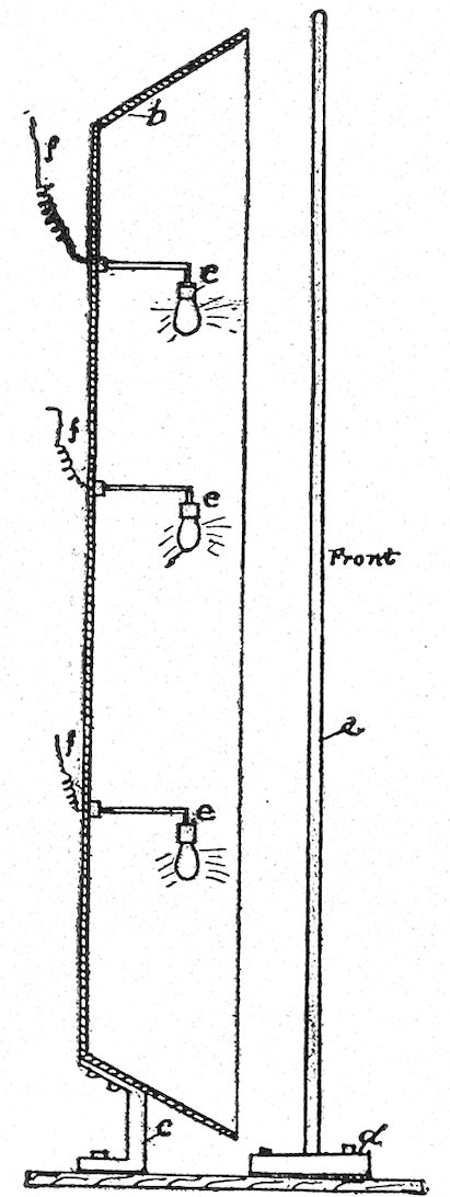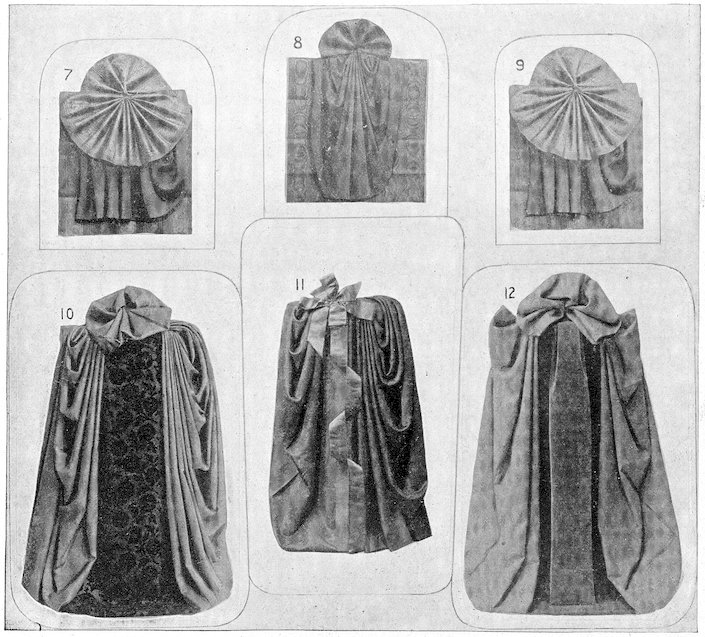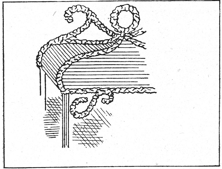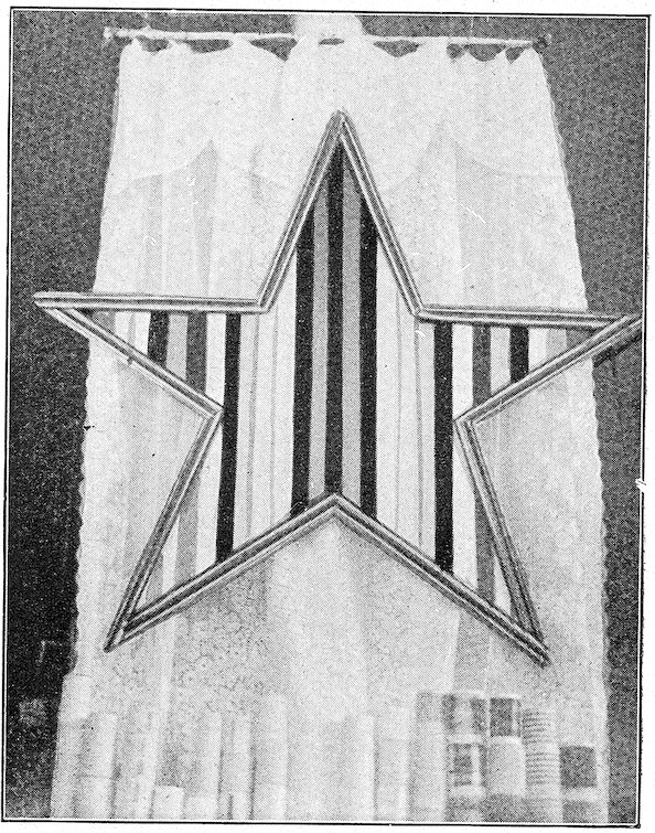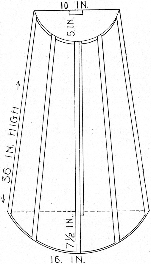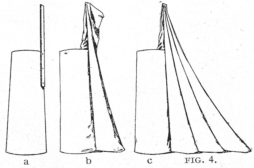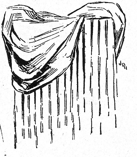 For upholstery work, such as pleating, puffing, draping and covering the frame with cloth, you will need a large pair of shears and an upholsterer’s hammer, which has a long, extended head. Also provide yourself with a small pincushion, 3 or 4 inches square, and put a loop of tape on opposite corners. These loops can be placed over two buttons of your vest, to hold it firmly in place, or you can pin the cushion by the loops to any part of your person. Don’t loan your tools to anyone. Keep them locked up in your tool box. Carry the box into the window with you, for then you have everything at hand you will be likely to need. Keep a supply of screw eyes and hooks, wire and cord in your box, for you will often need them. Tools for electrical work will be explained in the chapter on electrical designs.