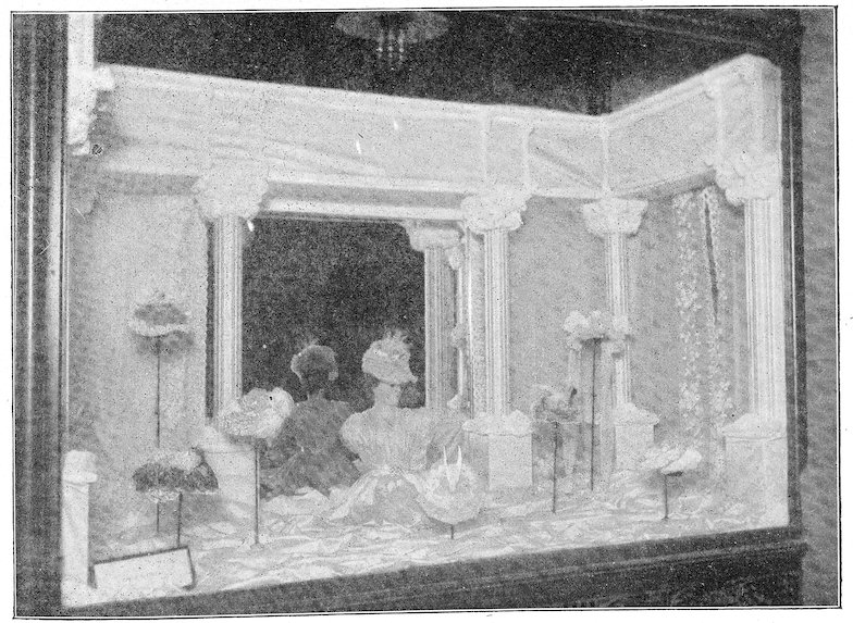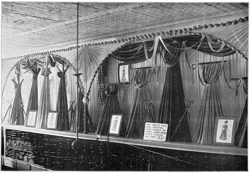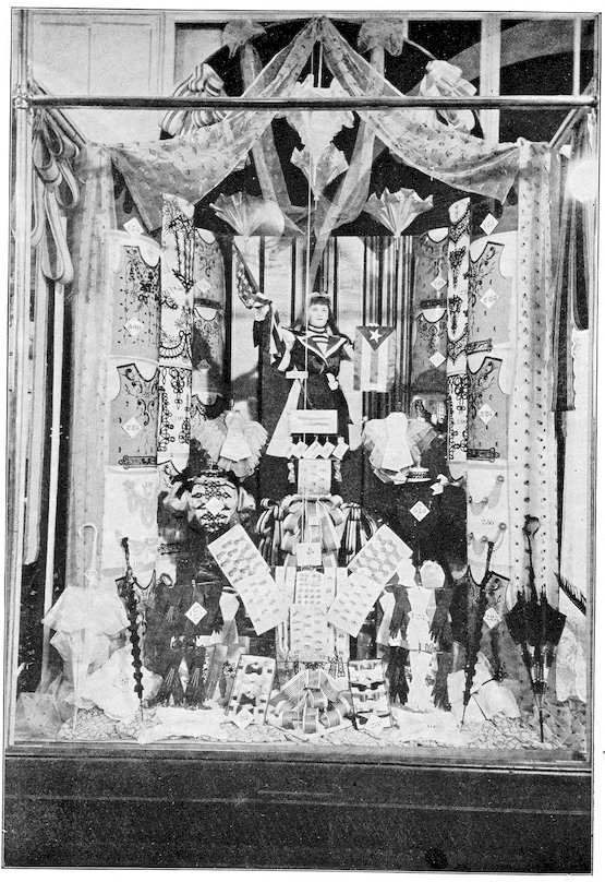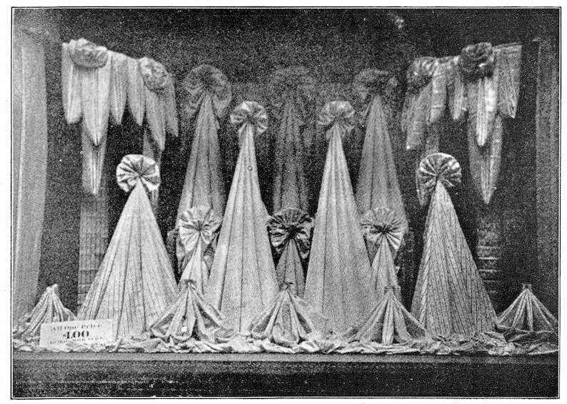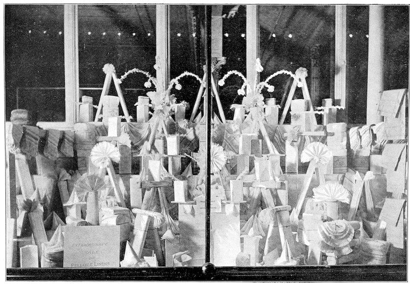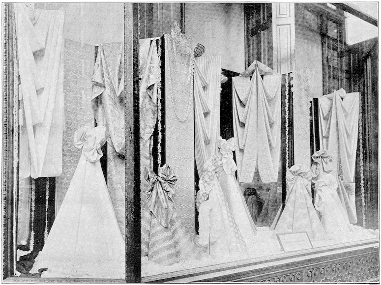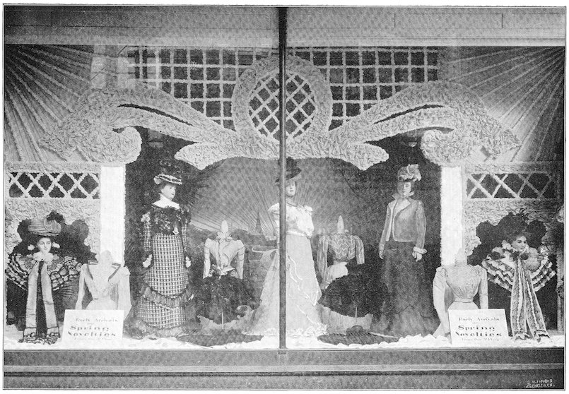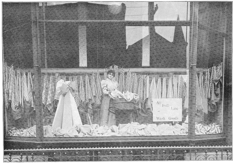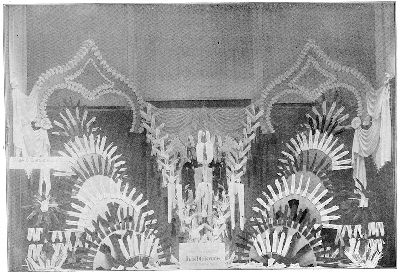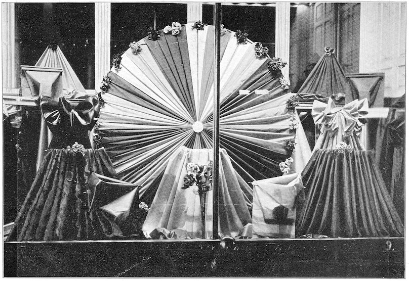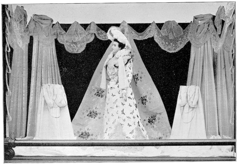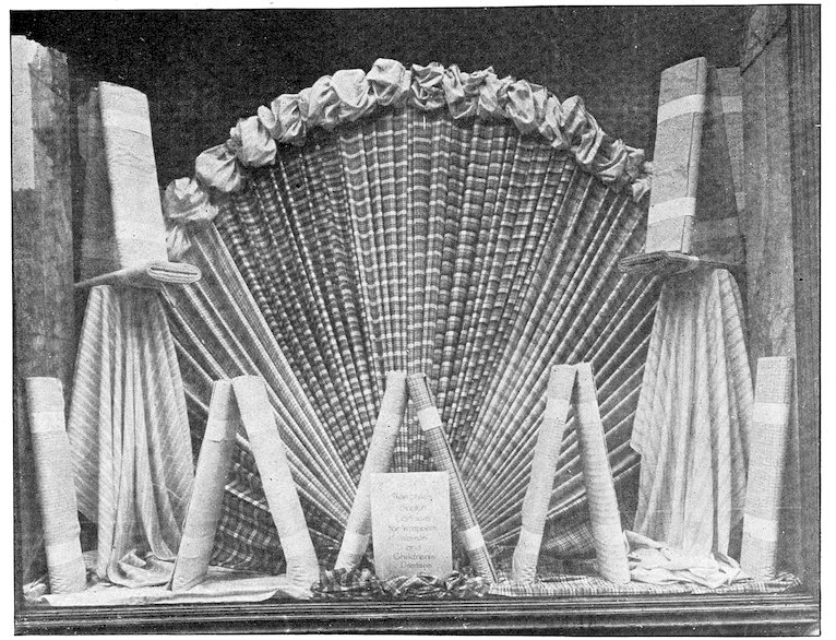 I have selected as examples of good trims in every line of dry goods some of the best designs that have appeared during the past three years in the popular window-trimming journal, The Show Window. In no other place could I hope to find such representative work of the best decorators in America, and as my selection has been made with great care, I feel it is a panorama of 241the most artistic and practical window displays ever yet congregated for the study and consideration of the thoughtful decorator. The Show Window is published under the auspices of The National Association of Window Trimmers of America, an organization that includes the most famous window trimmers in the United States and Canada and has done more to advance decorative art in America than any other institution.