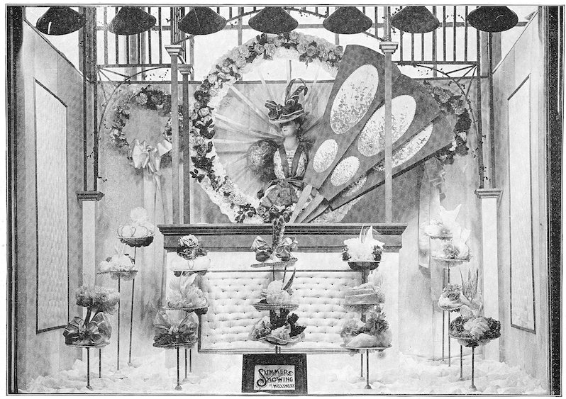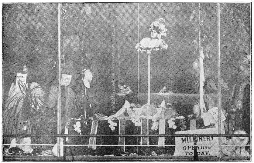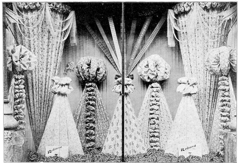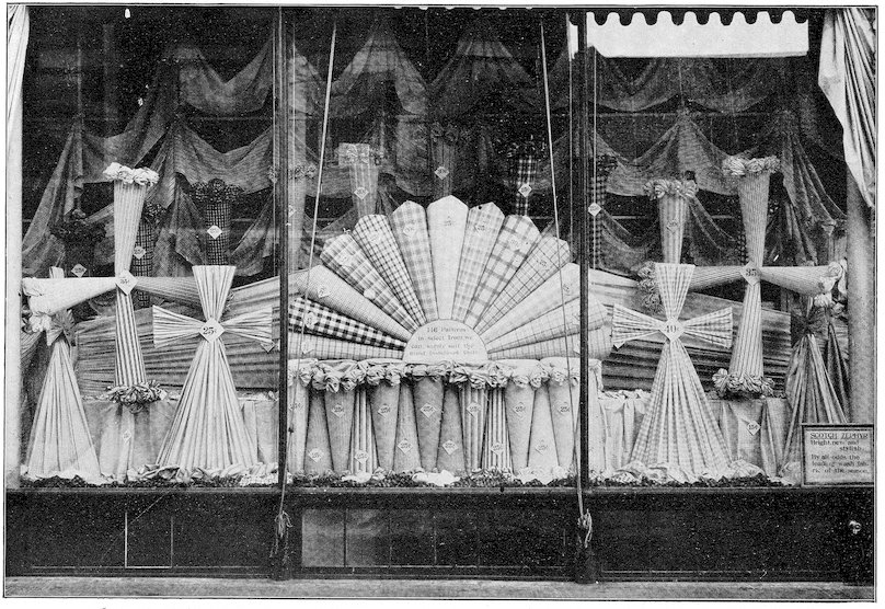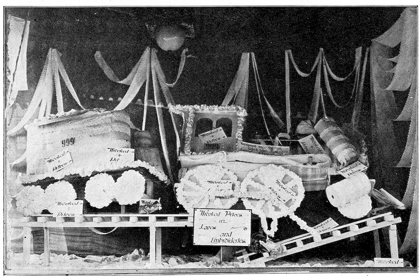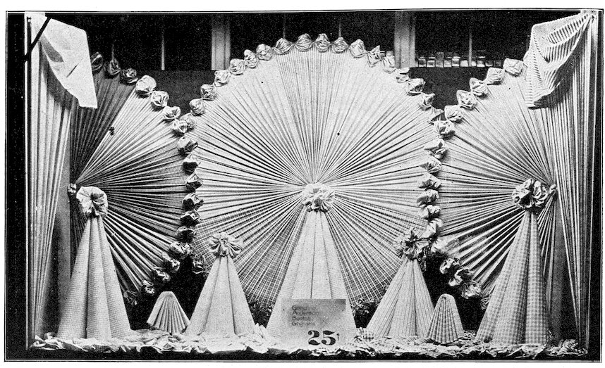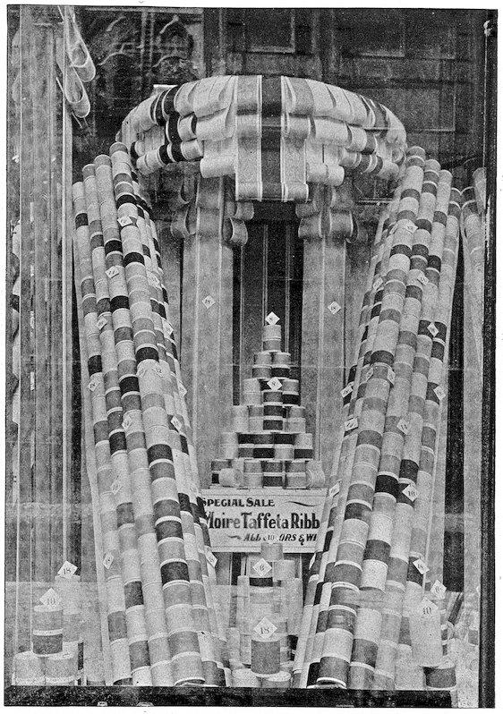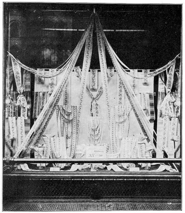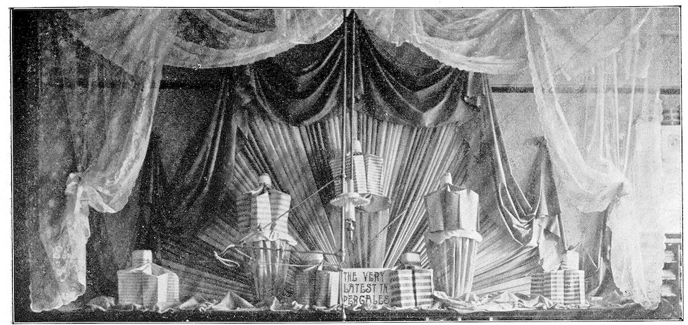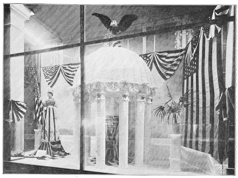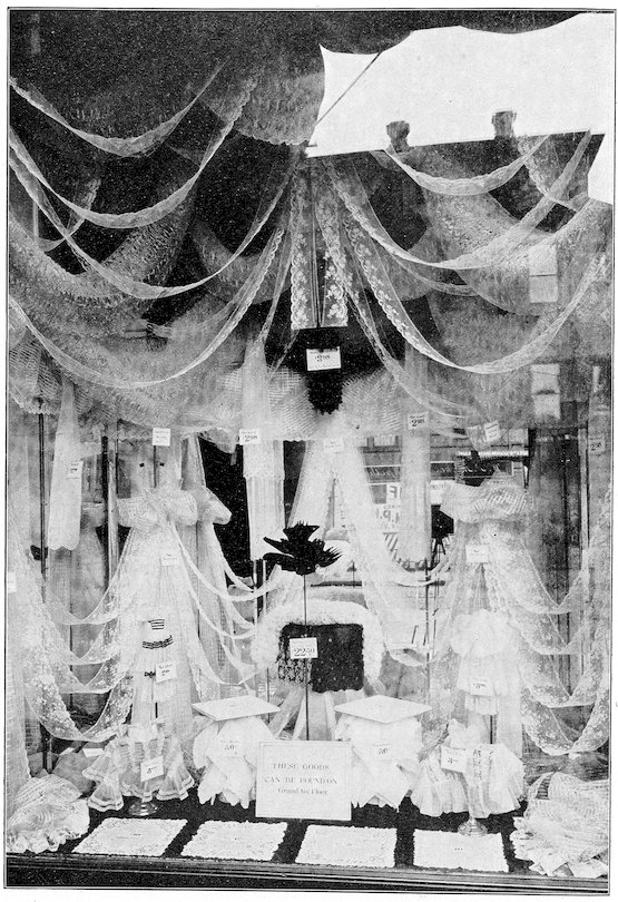 I have selected as examples of good trims in every line of dry goods some of the best designs that have appeared during the past three years in the popular window-trimming journal, The Show Window. In no other place could I hope to find such representative work of the best decorators in America, and as my selection has been made with great care, I feel it is a panorama of 241the most artistic and practical window displays ever yet congregated for the study and consideration of the thoughtful decorator. The Show Window is published under the auspices of The National Association of Window Trimmers of America, an organization that includes the most famous window trimmers in the United States and Canada and has done more to advance decorative art in America than any other institution.