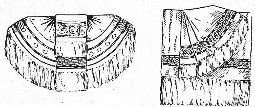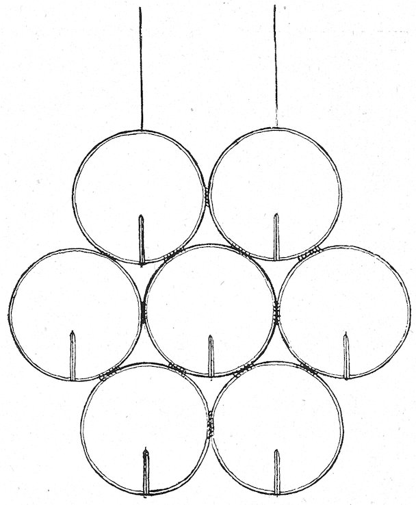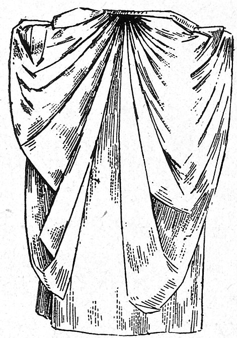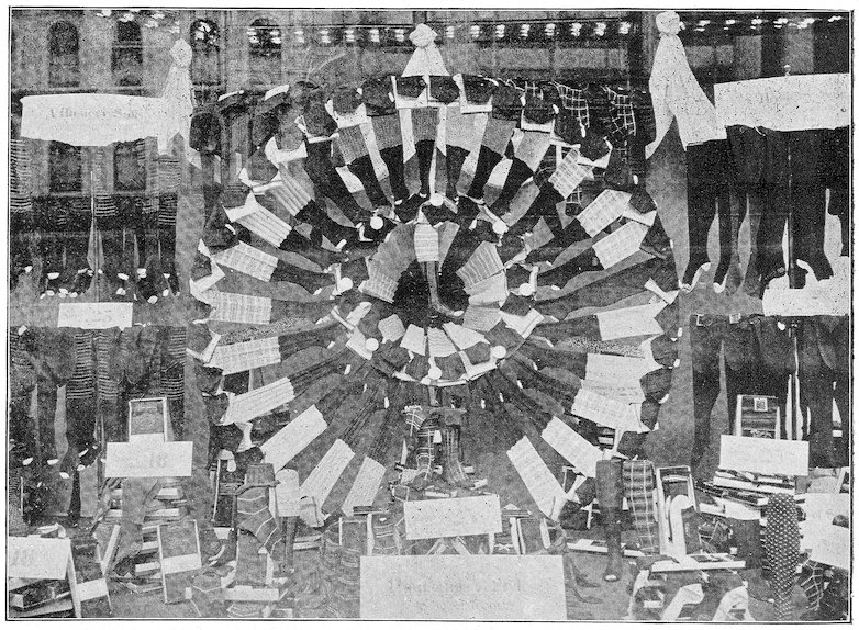 HOSIERY DISPLAY BUILT OVER TWO CIRCLES, ONE PLACED BACK OF THE OTHER AND ONE-HALF THE DIAMETER OF THE FIRST.—Griffith.