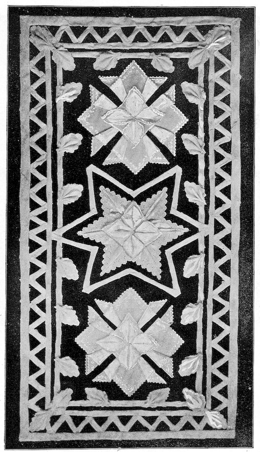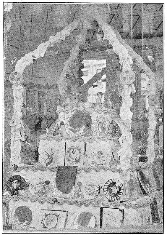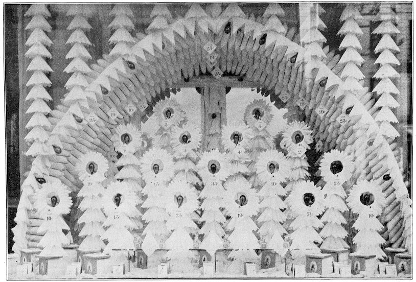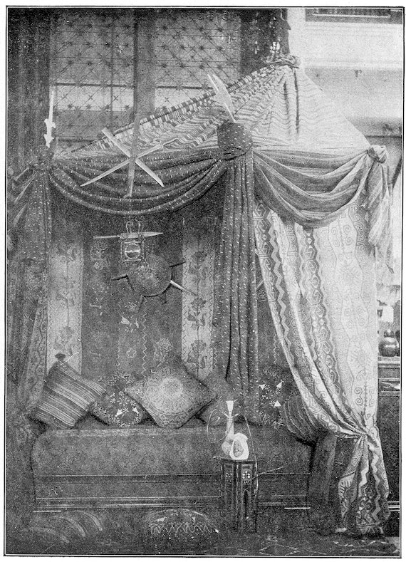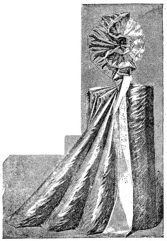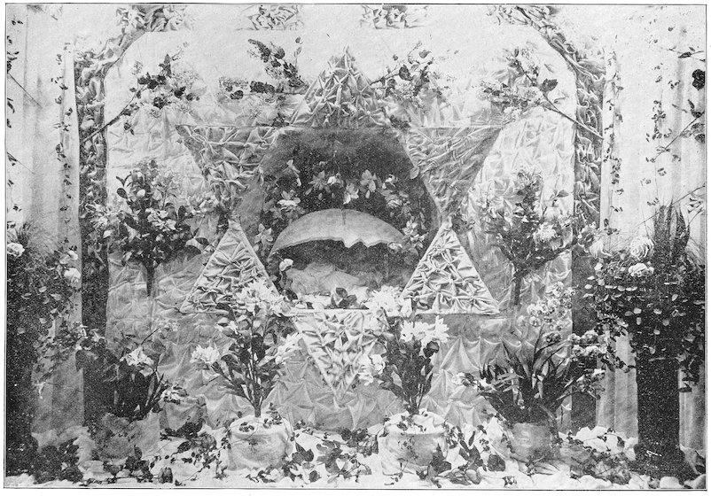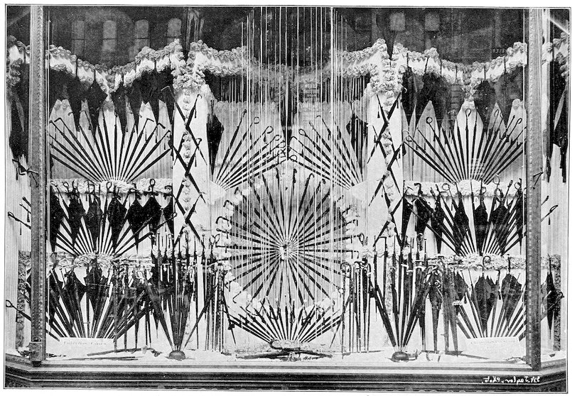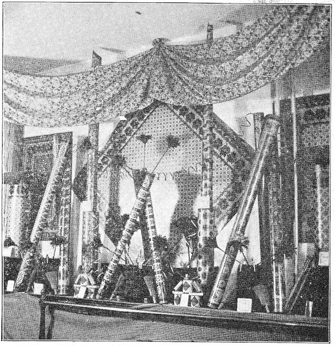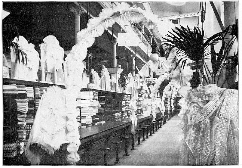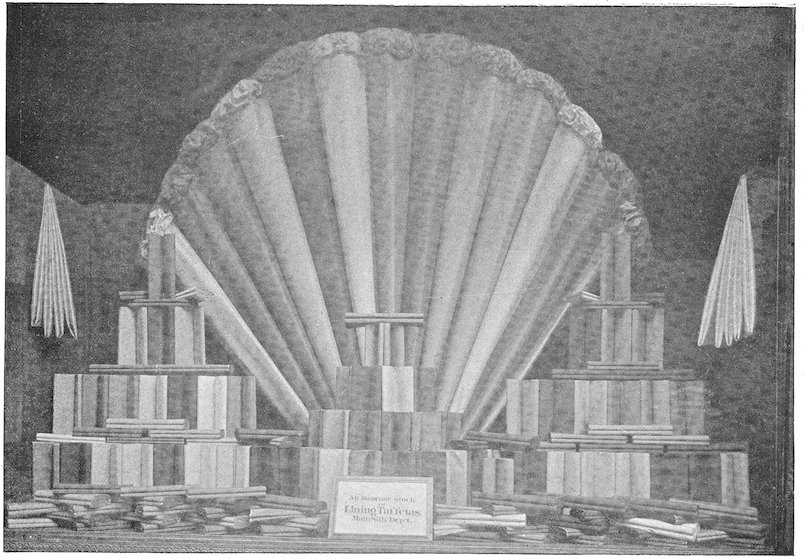 RIBBON DISPLAY. SIDES ARE DUMMY BOLTS LAID UPON PLANKS. CENTRAL CANOPY IS FORMED OVER HOOPS.—Griffith.