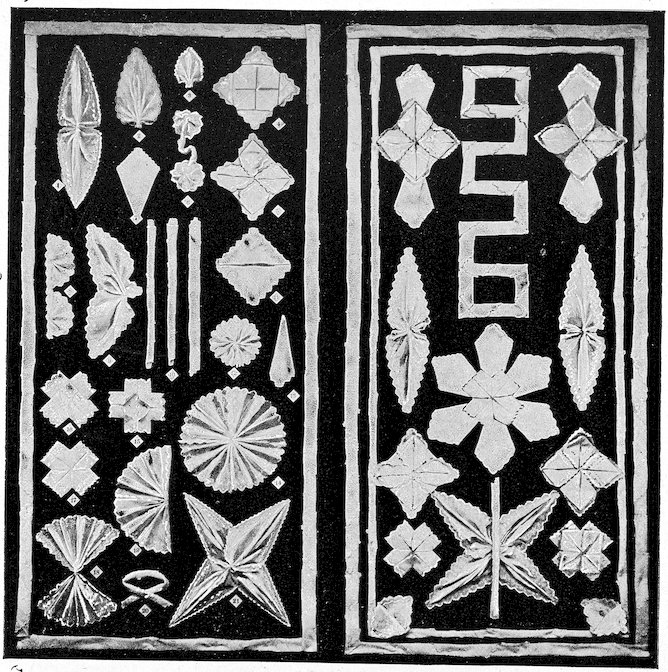 DISPLAY OF PASSEMENTERIES, FASTENED TO WHITE CARDBOARD. CENTRAL SUNBURST IS LIGHT PINK.—Ross.