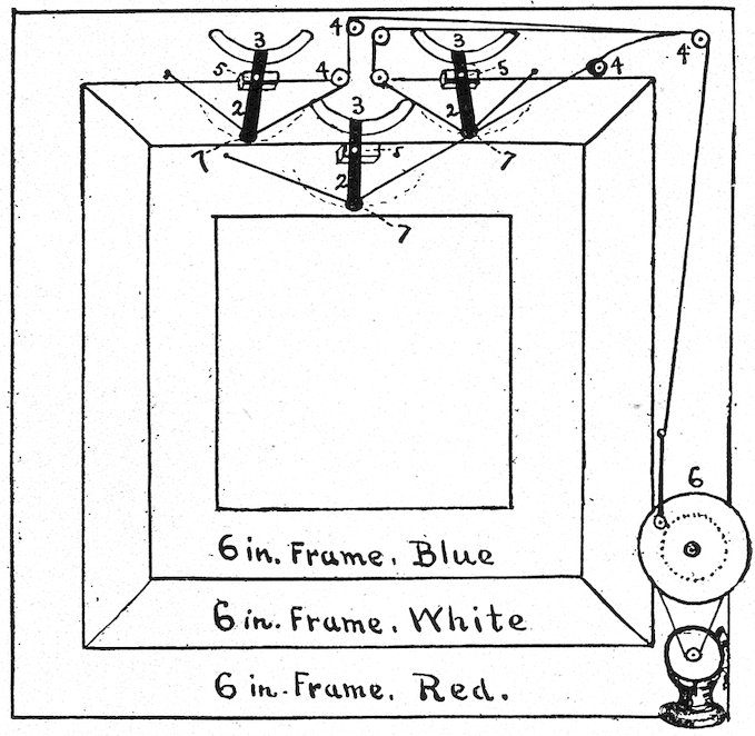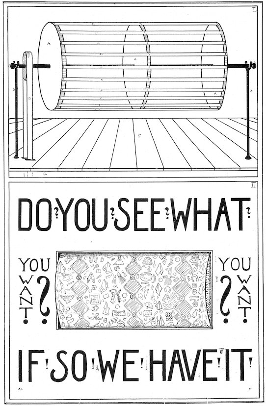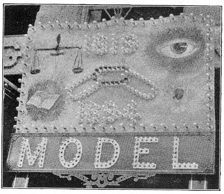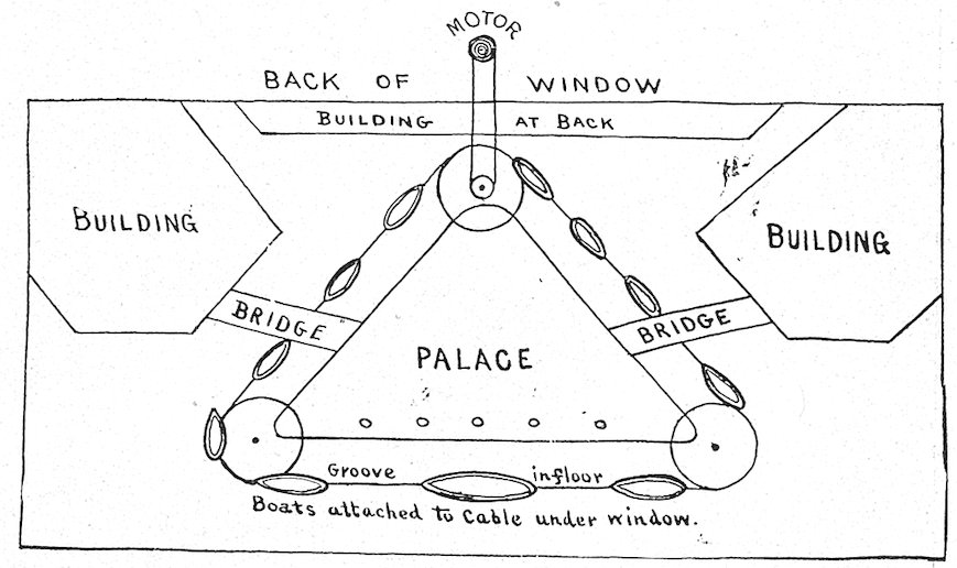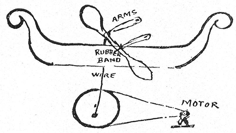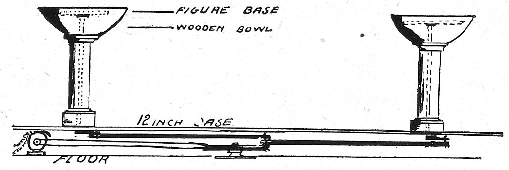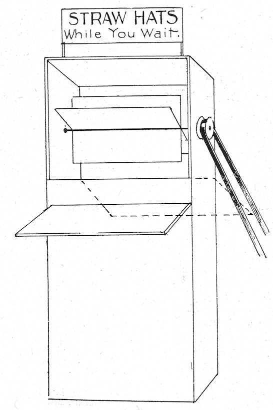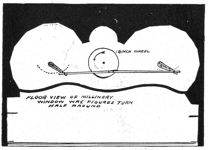The central design is a man with a wheelbarrow, and another with a scoop shovel. The barrow should be loaded with notions, laces, handkerchiefs, gloves, etc. This feature may be made mechanical by having the barrow rest on an iron brace just back of the wheel, and another brace fastened to the floor and running up the pants leg of the man holding the barrow. Cut a slot in the floor so that the wheel of the barrow just touches an endless band beneath. Have the man’s knees and hips jointed and connected with a rod running through another slot in the floor and connected with a wheel underneath, so that the same motion is obtained as when a man rides a bicycle. One motor will operate both the man’s legs and the wheel of the barrow. The floor should be strewn with the same class of goods contained in the barrow and a small heap should be just in front of the scoop shovel. It would be well to have a small price card fastened to each article.