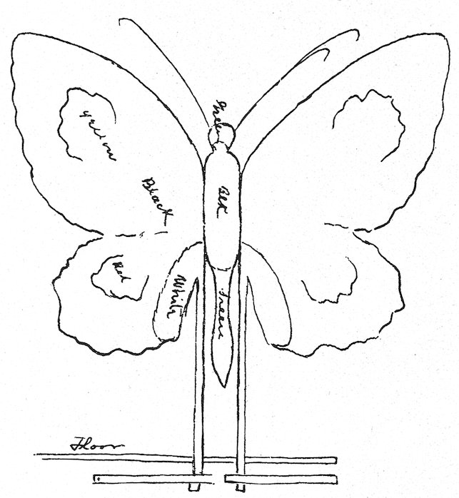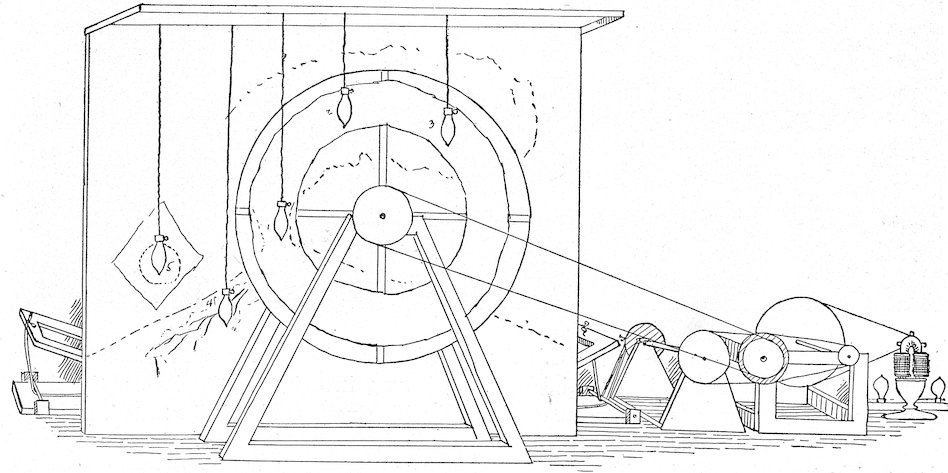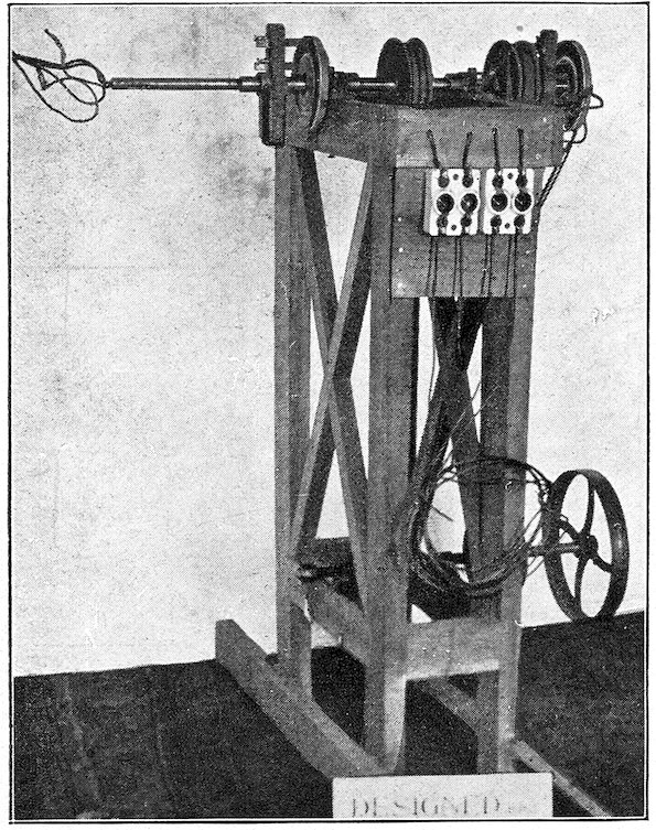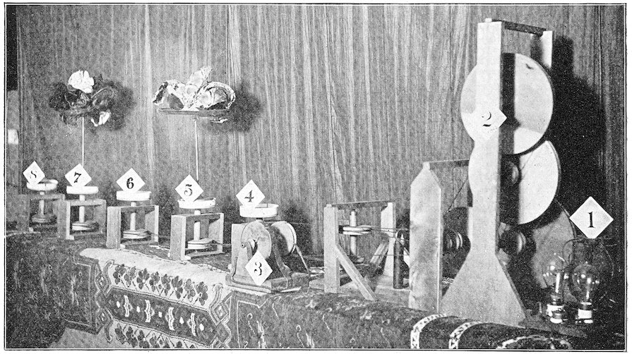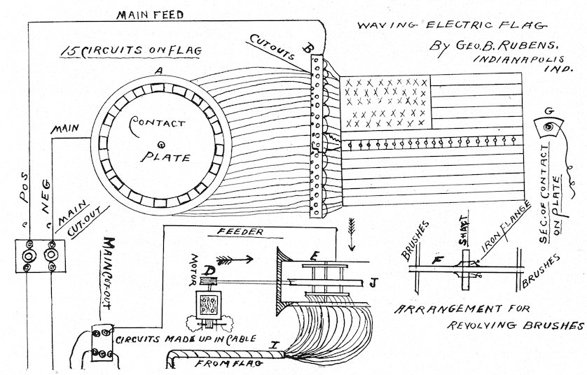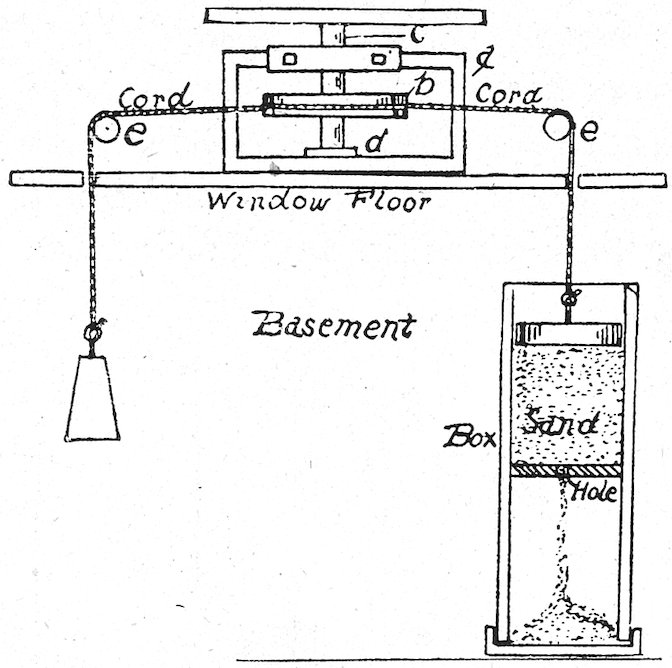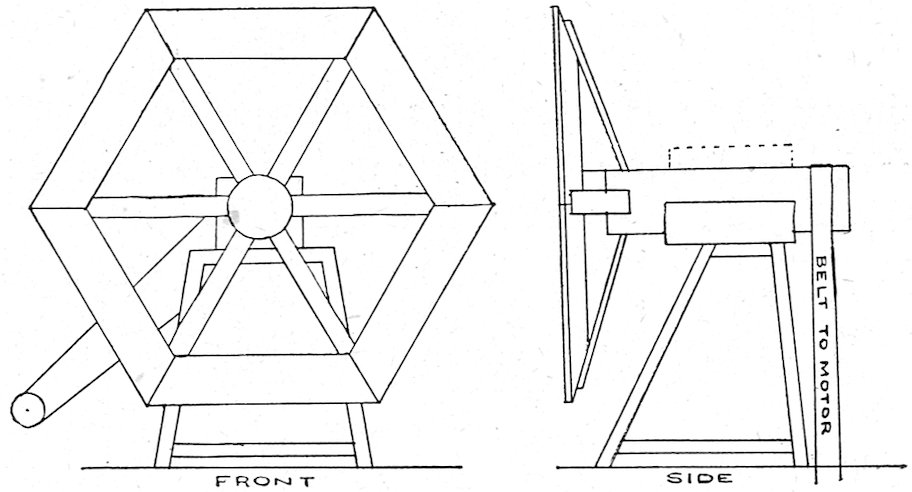 The central design is a man with a wheelbarrow, and another with a scoop shovel. The barrow should be loaded with notions, laces, handkerchiefs, gloves, etc. This feature may be made mechanical by having the barrow rest on an iron brace just back of the wheel, and another brace fastened to the floor and running up the pants leg of the man holding the barrow. Cut a slot in the floor so that the wheel of the barrow just touches an endless band beneath. Have the man’s knees and hips jointed and connected with a rod running through another slot in the floor and connected with a wheel underneath, so that the same motion is obtained as when a man rides a bicycle. One motor will operate both the man’s legs and the wheel of the barrow. The floor should be strewn with the same class of goods contained in the barrow and a small heap should be just in front of the scoop shovel. It would be well to have a small price card fastened to each article.